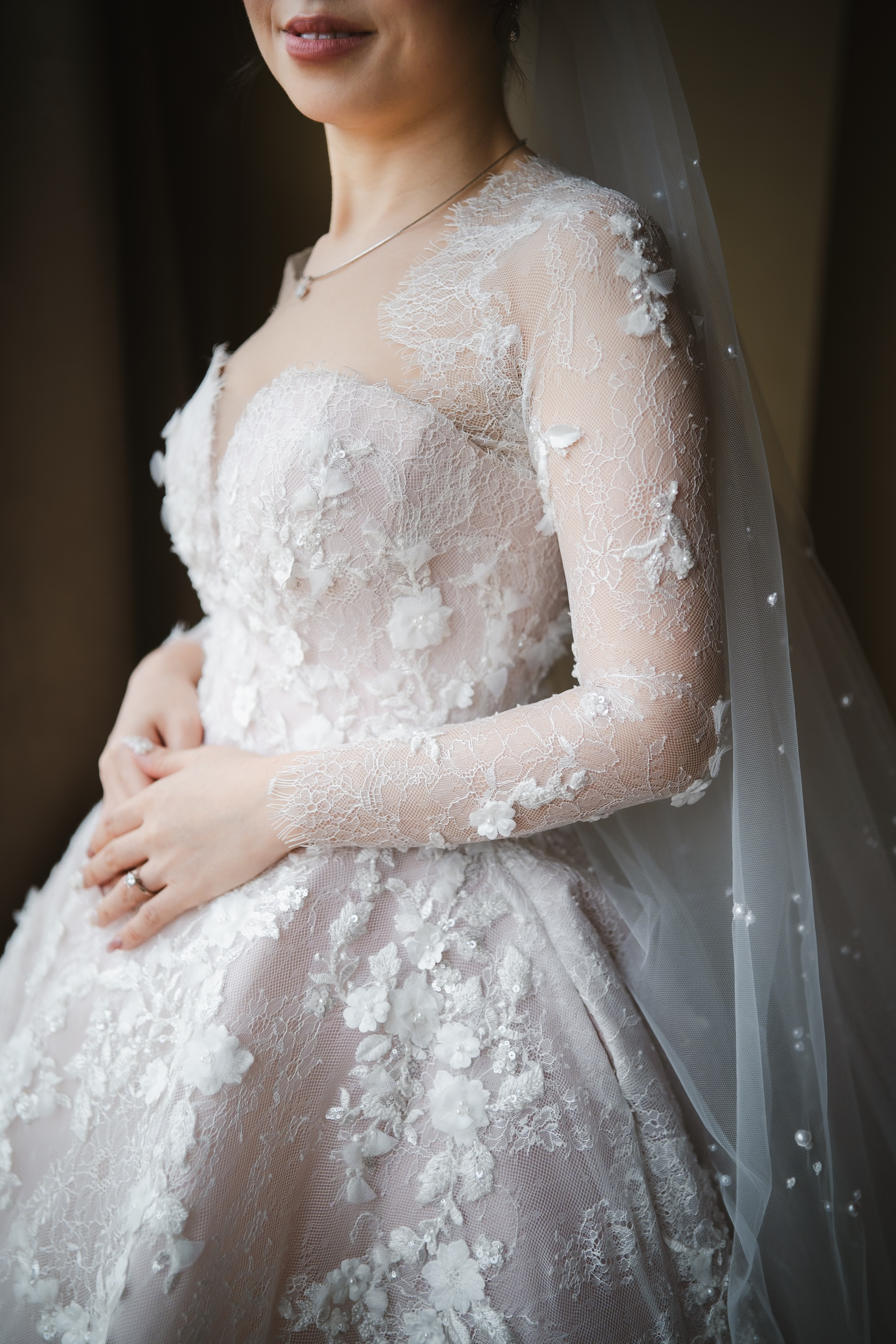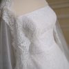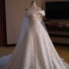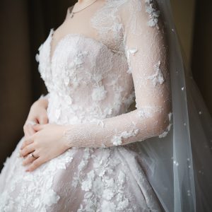 A-line wedding gown features a soft blush-colored base adorned with delicate 3D floral appliqués, creating a romantic and feminine silhouette. Paired with a matching long sleeved bolero, the gown allows two distinct looks—graceful and modest for the holy matrimony, and effortlessly elegant for the reception.