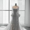 Contemporary mermaid wedding dress with drapery and eye catching see through parts on waist. Add a detachable skirt and sleeves of your choice to get the second look for your big day.