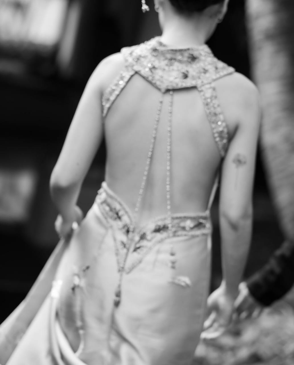 Backless cream cheongsam with embroider cap.
