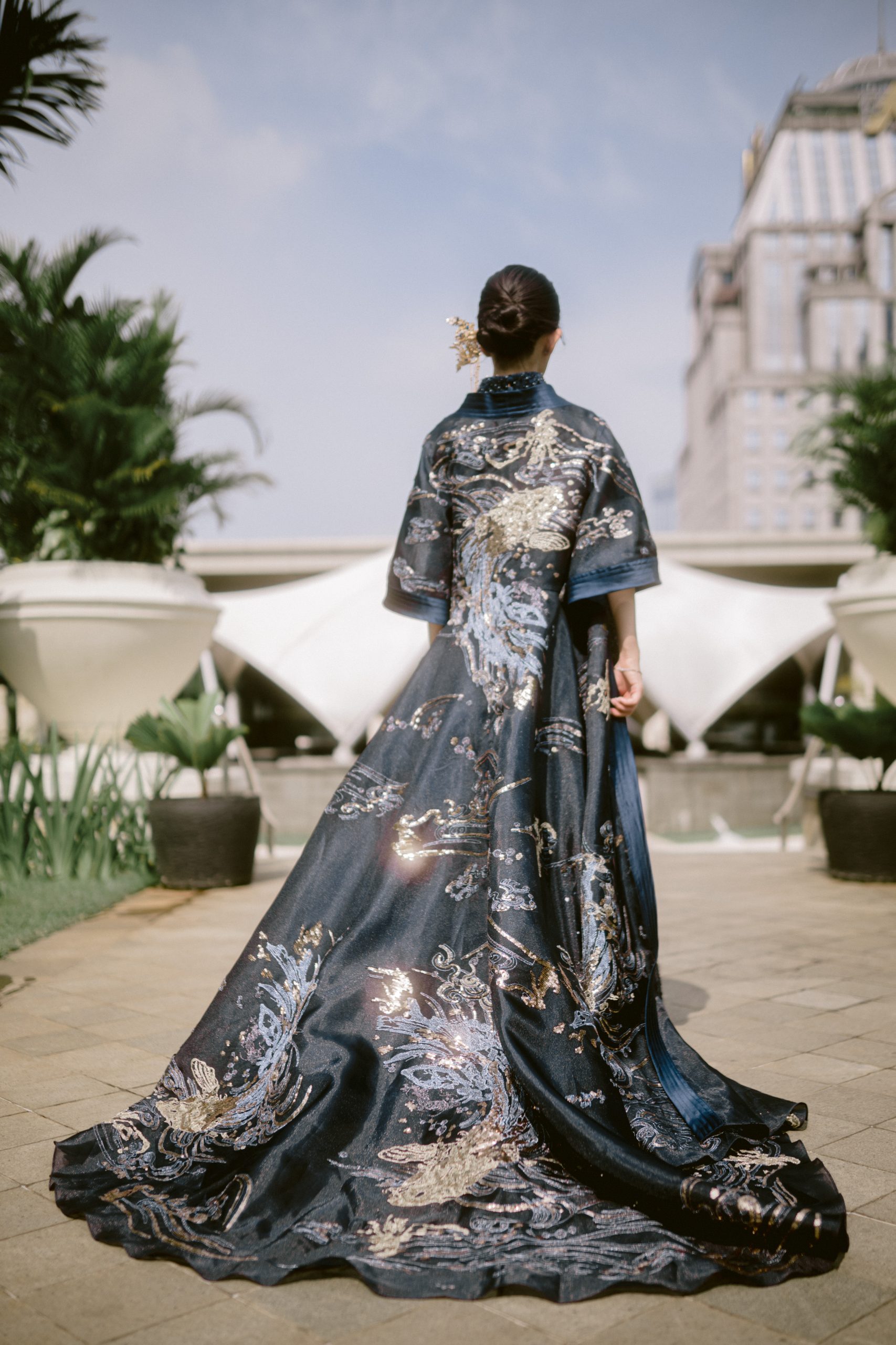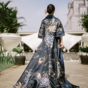 Backless sequin cheongsam as inner + fully embroidered outer.