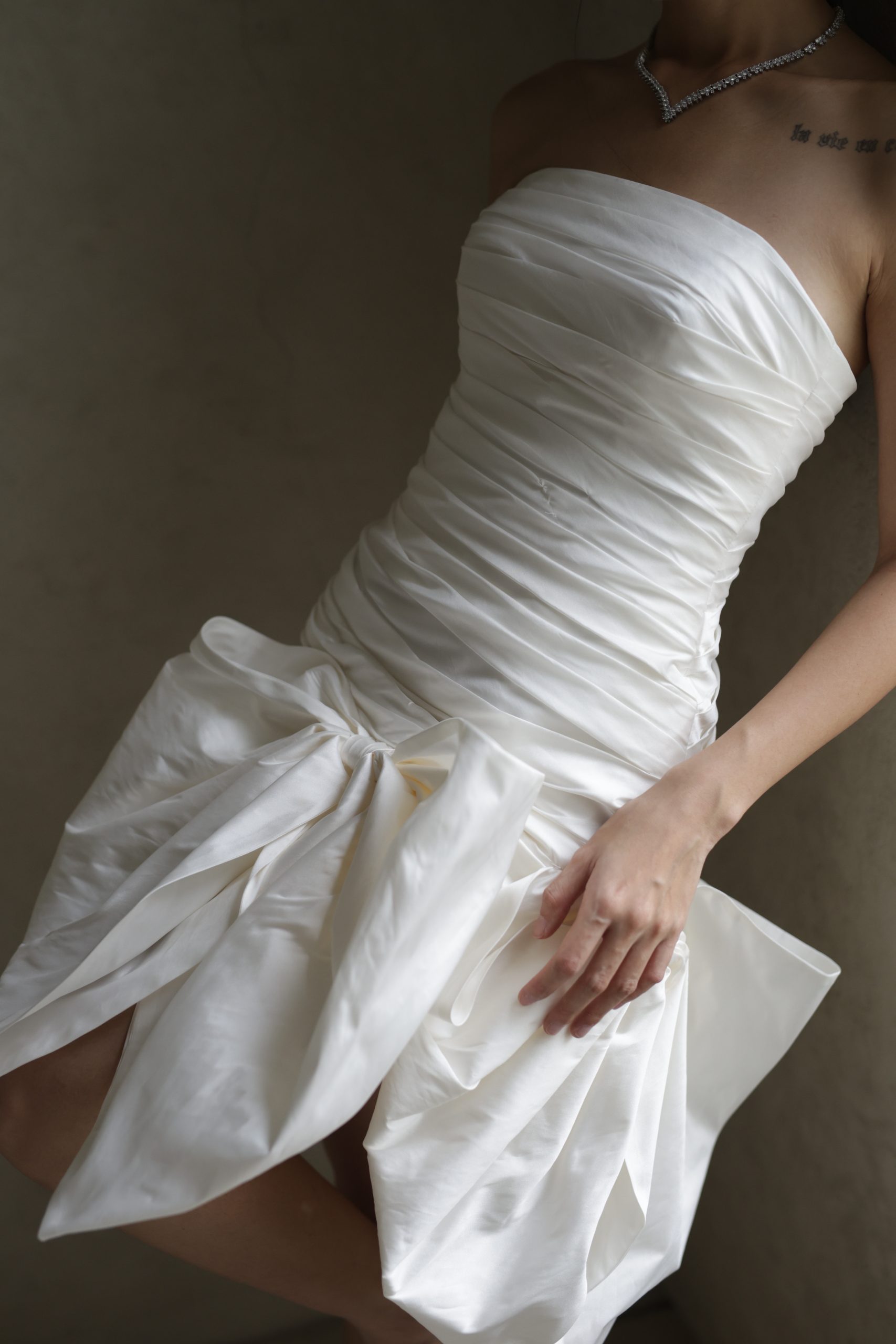 A chic short dress with a stunning statement bow, perfect for brides who want to shine after the ceremony or for dreamy pre-wedding photoshoot!