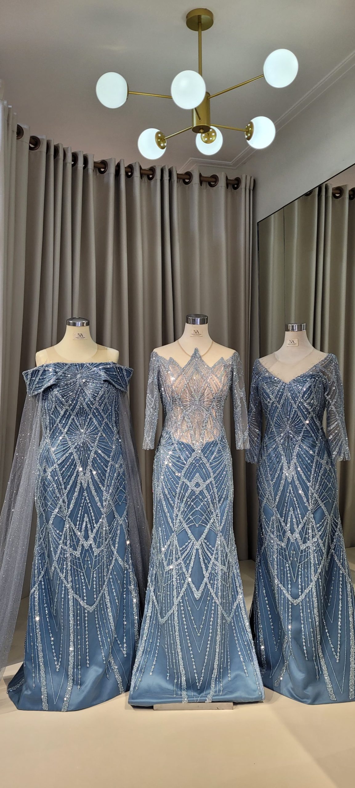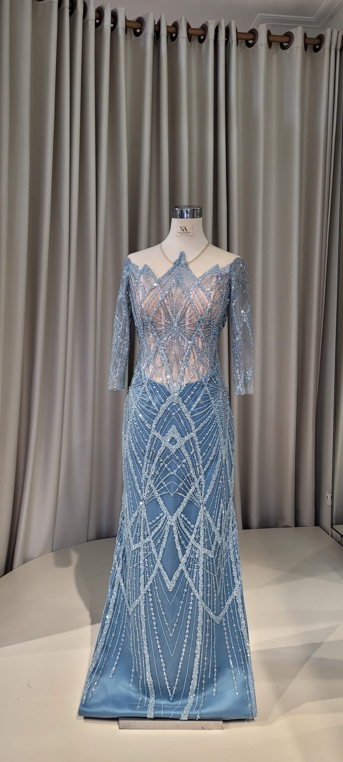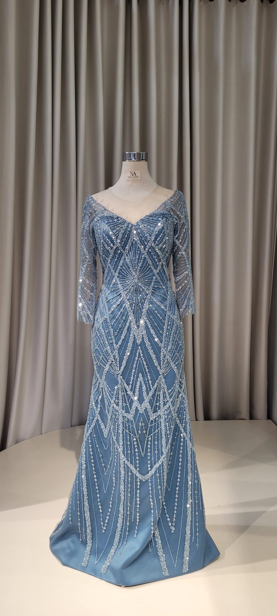 - Full lace blue mermaid dress with nude base on upper pat, and long sleeves