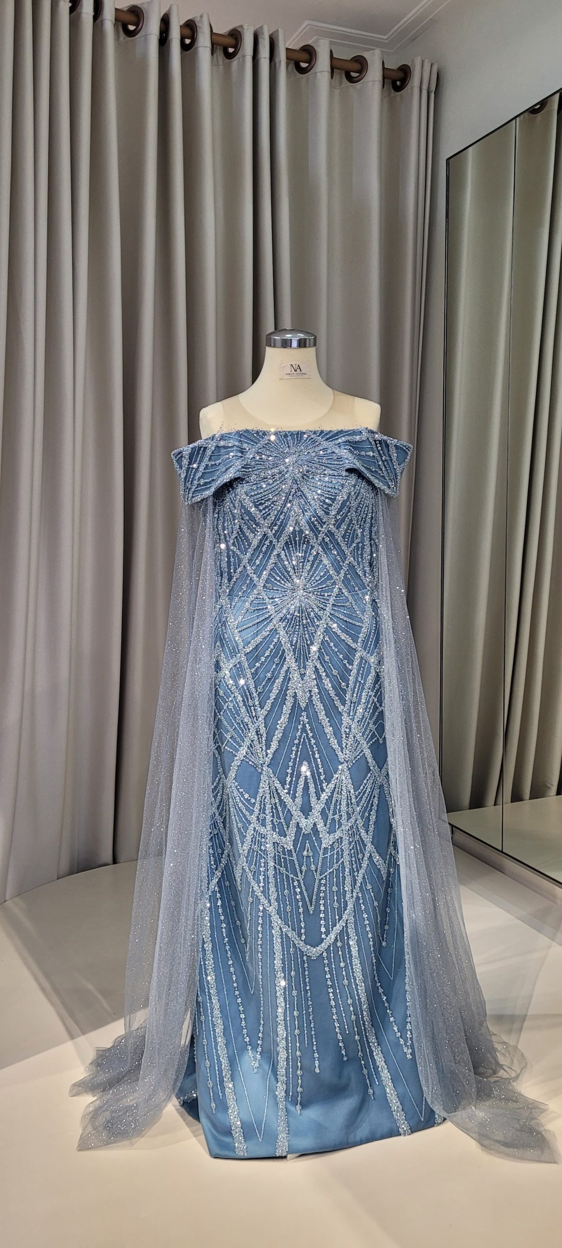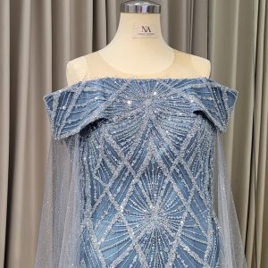 - Full lace blue mermaid dress with off shoulder sleeves and tulle cap