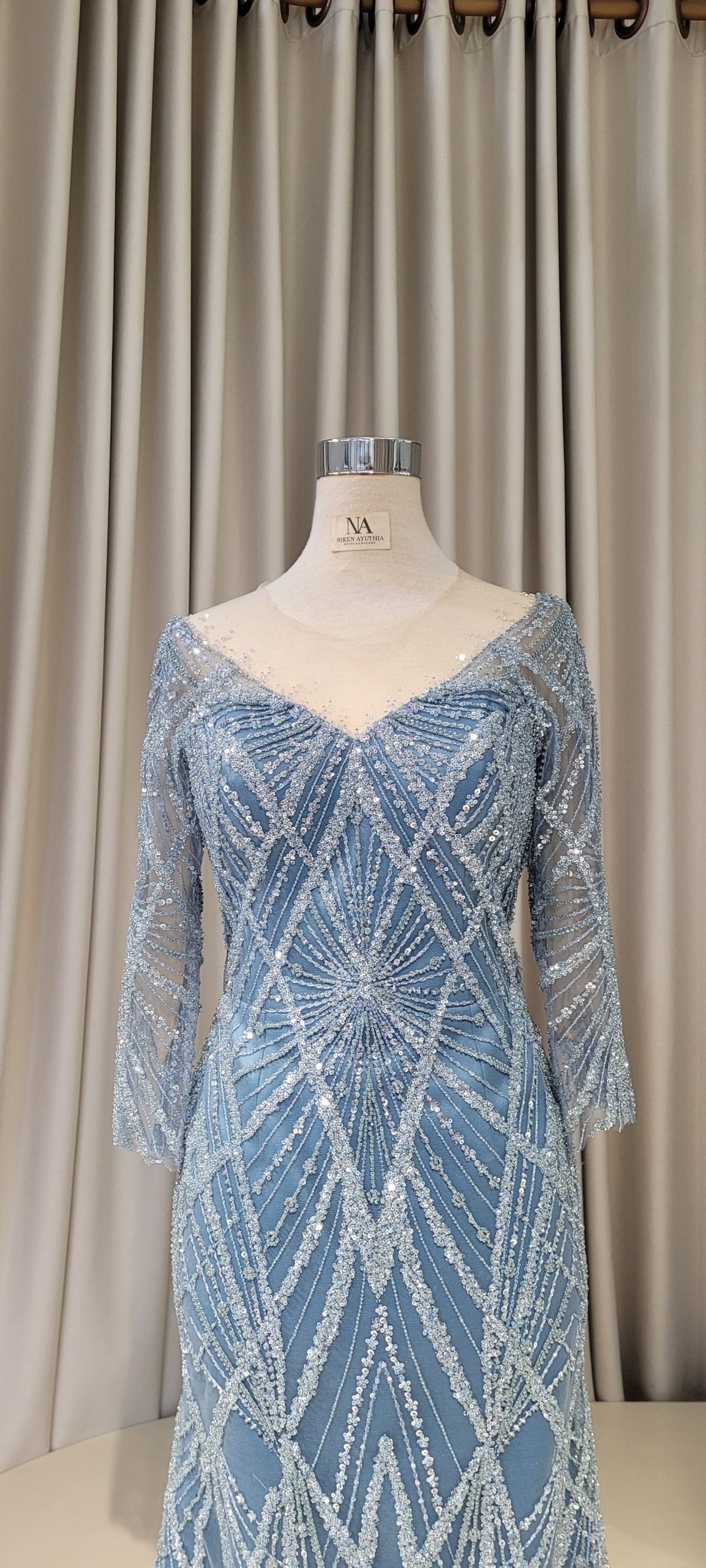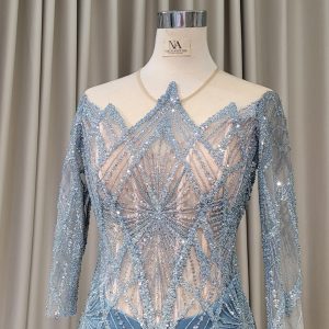 - Full lace blue mermaid dress with long sleeves.