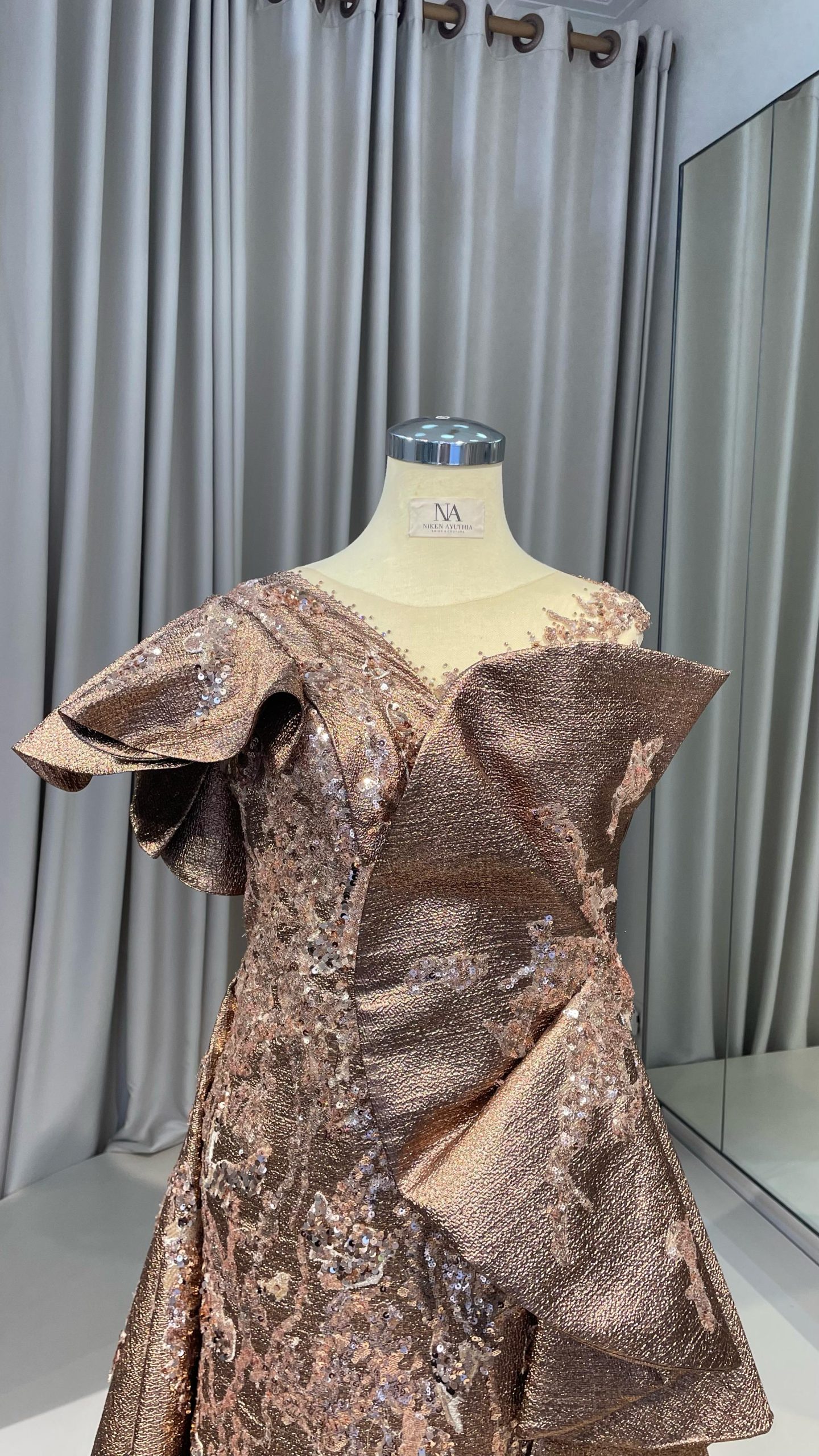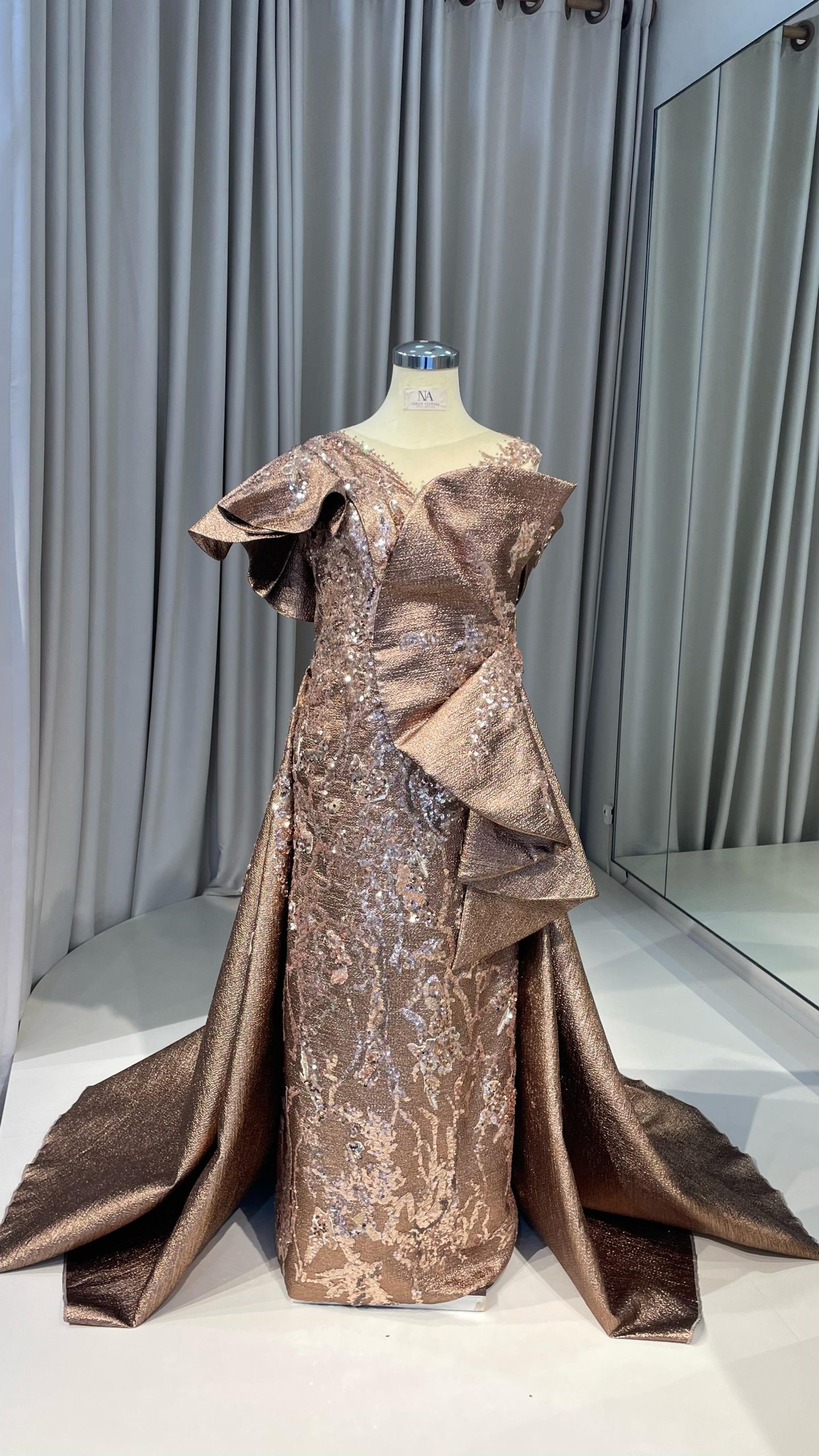 Bronze H-line dress with drapery on the waist, butterfly sleeves, and train.