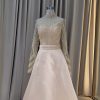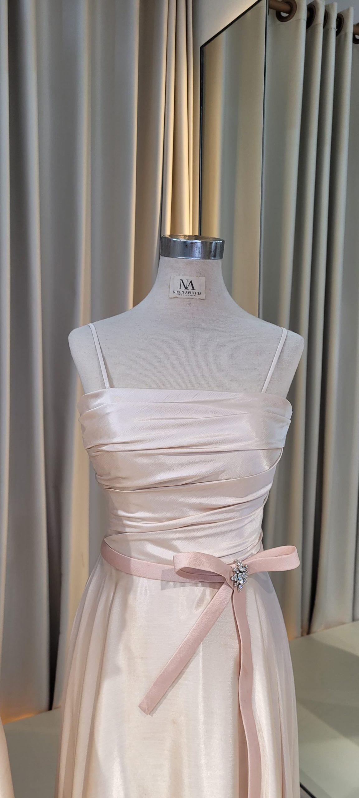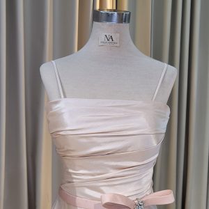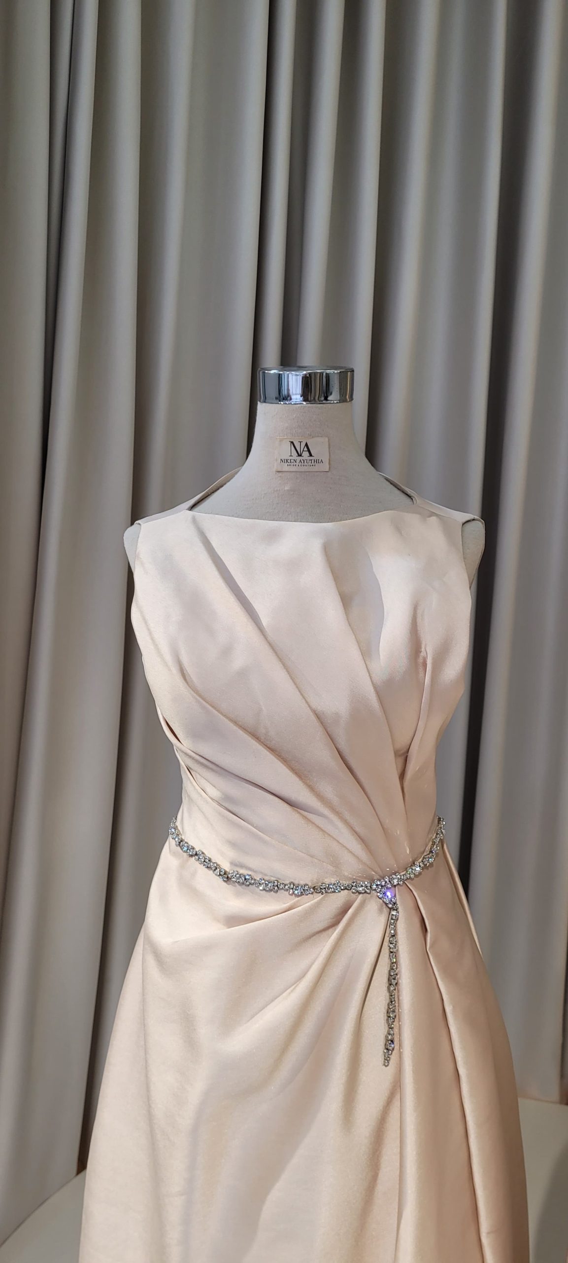 Champagne A-line dress with drapery and crystals detail on the waist