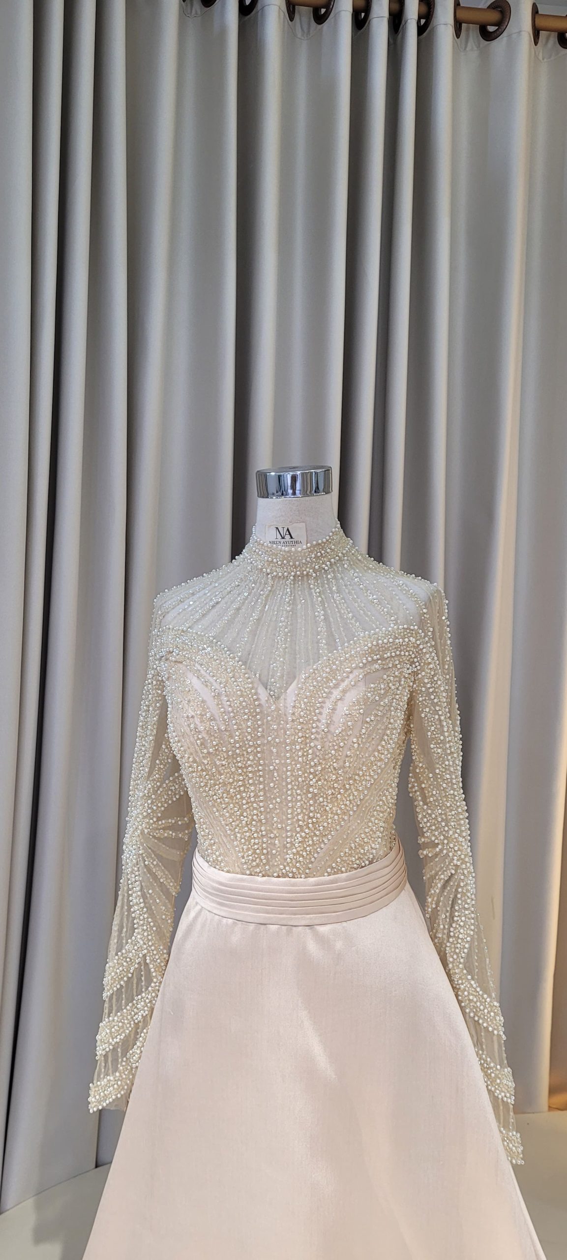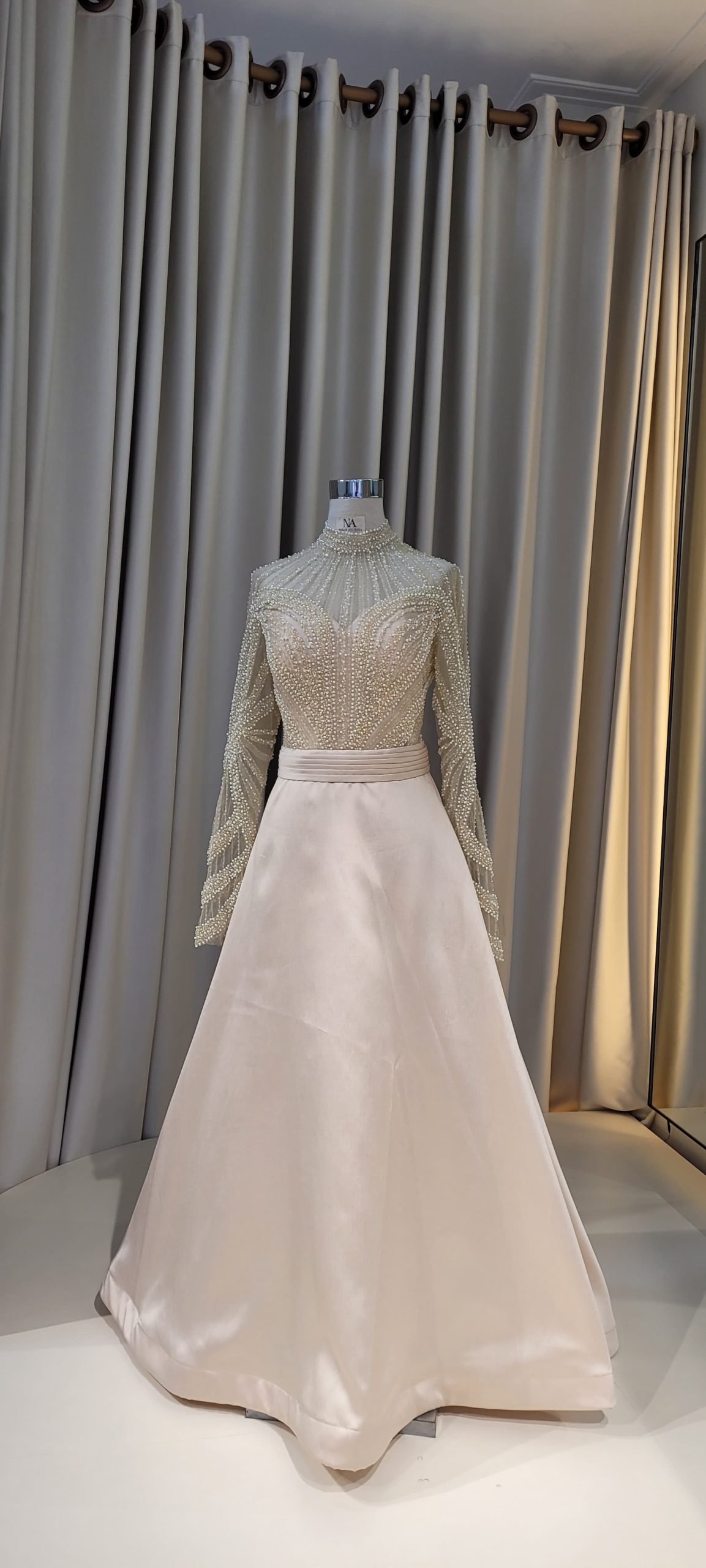 Champagne A-line dress with lace on upper part and long sleeves.