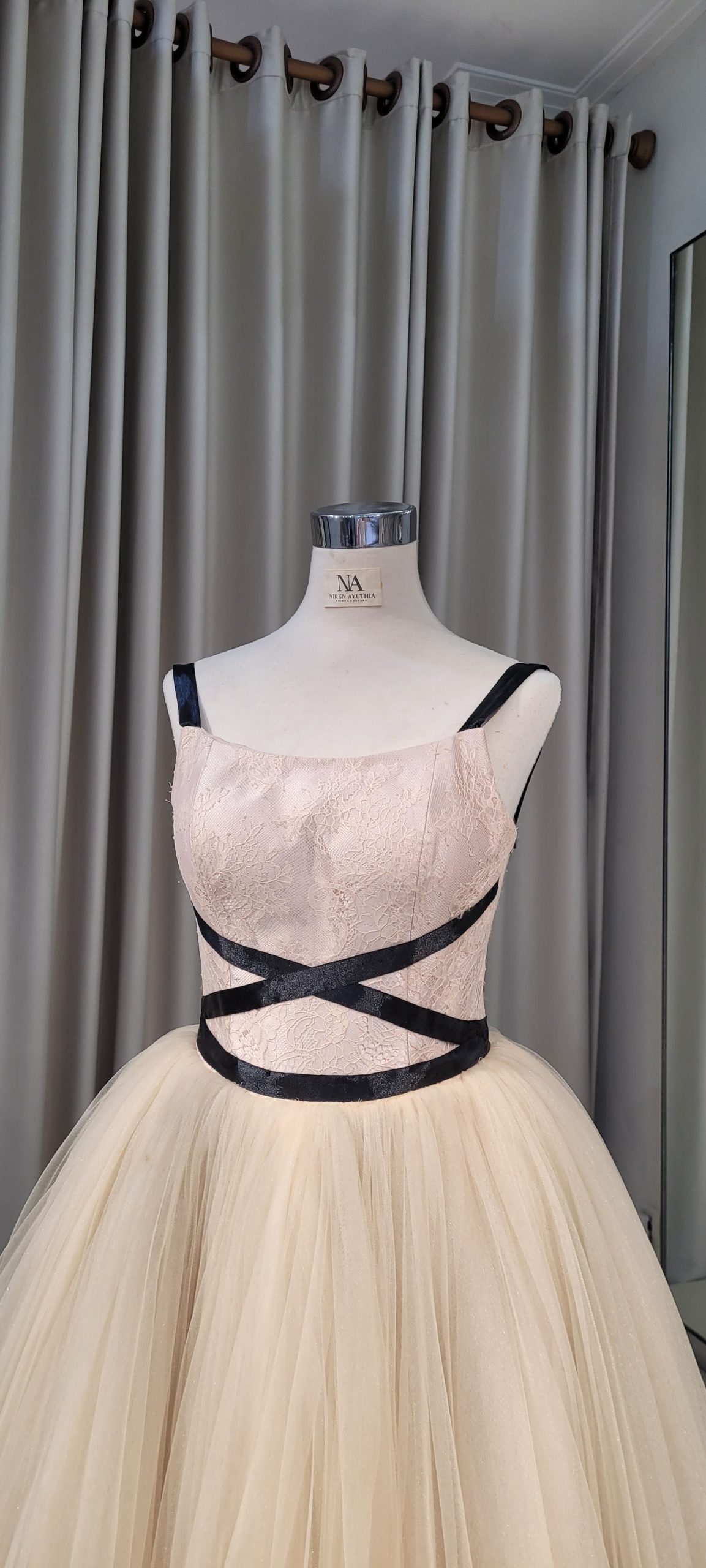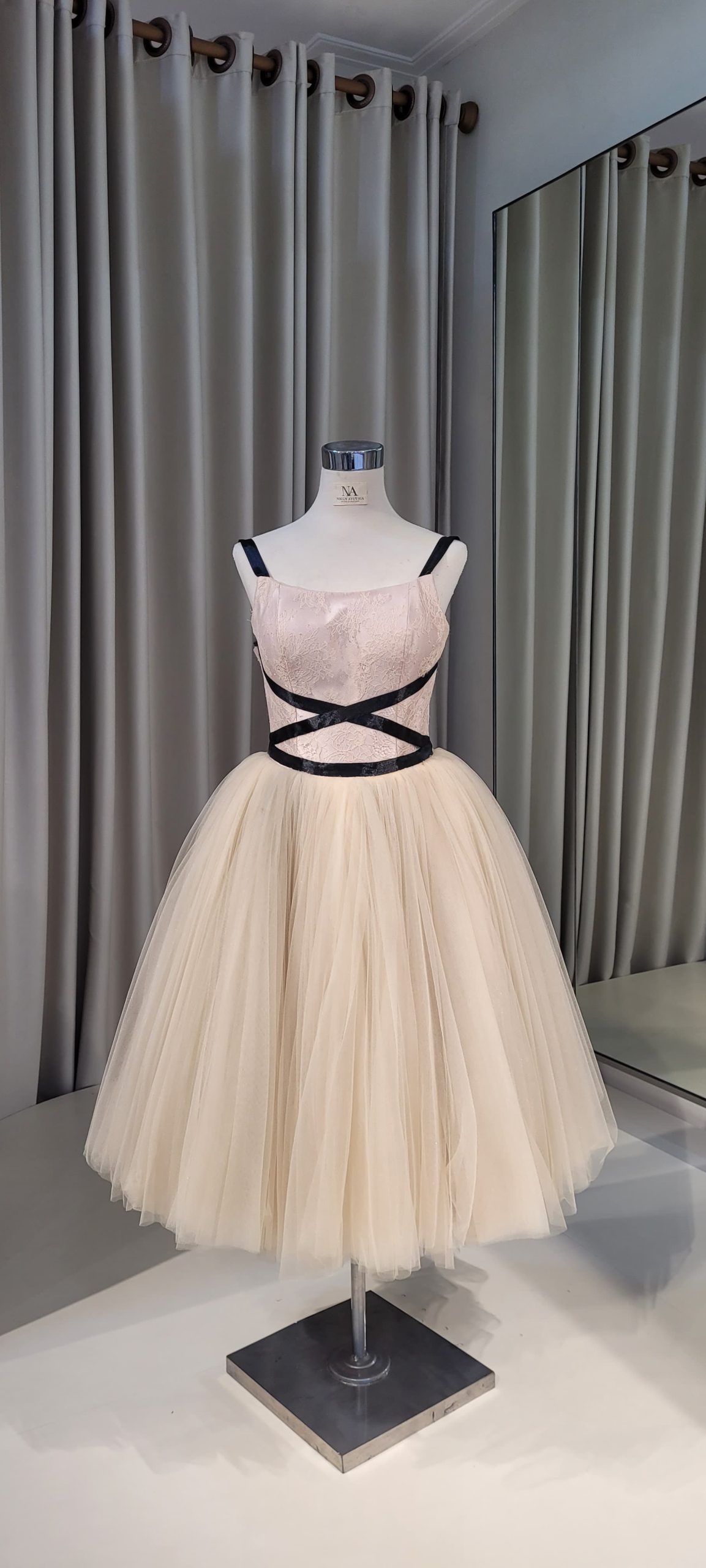 Champagne A-line dress with tulle skirt and black ribbon details.