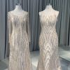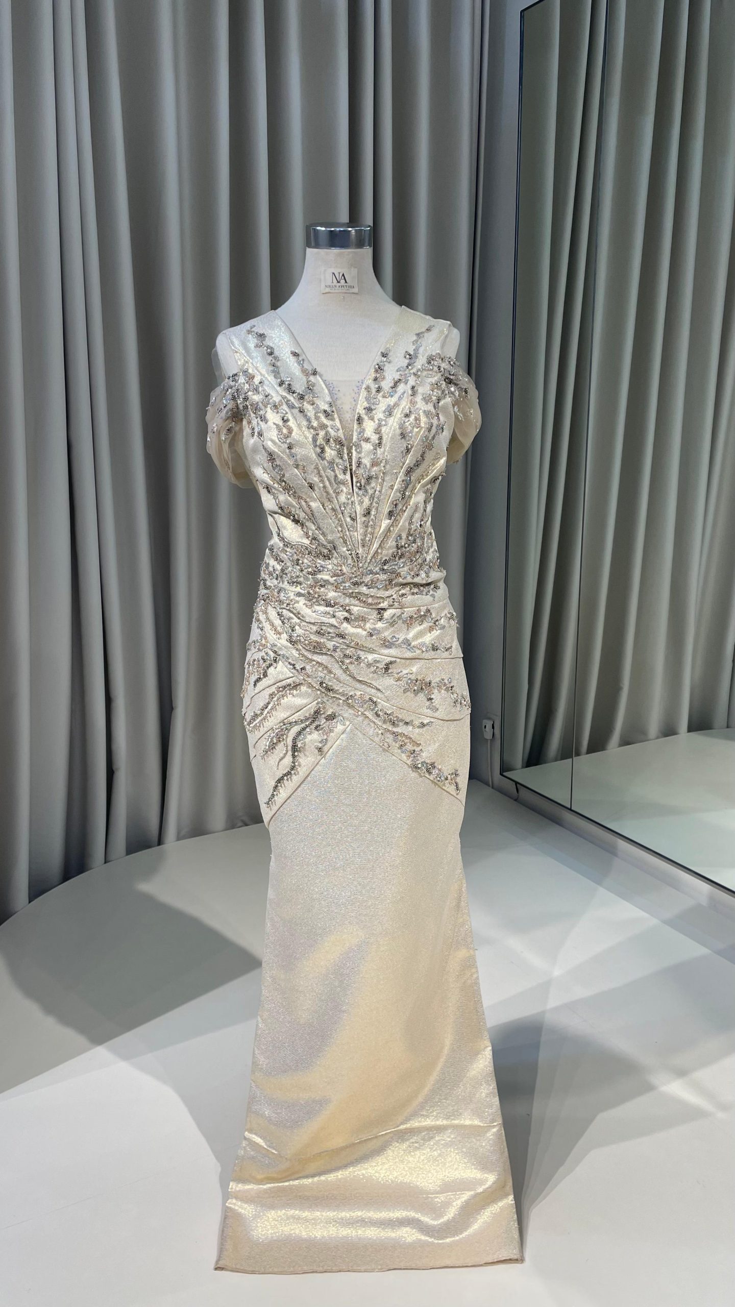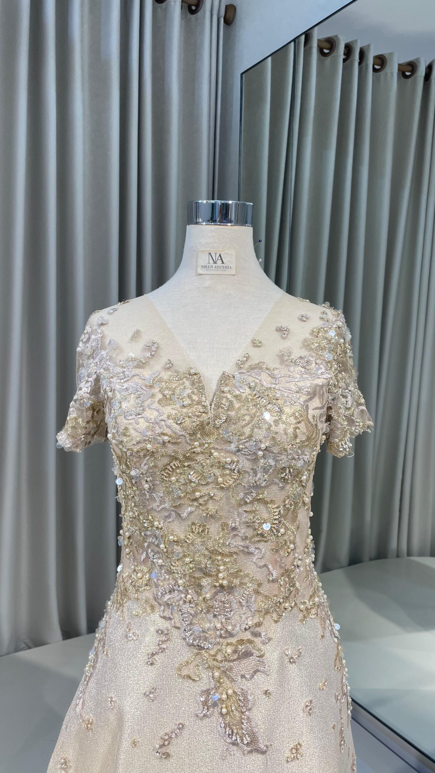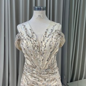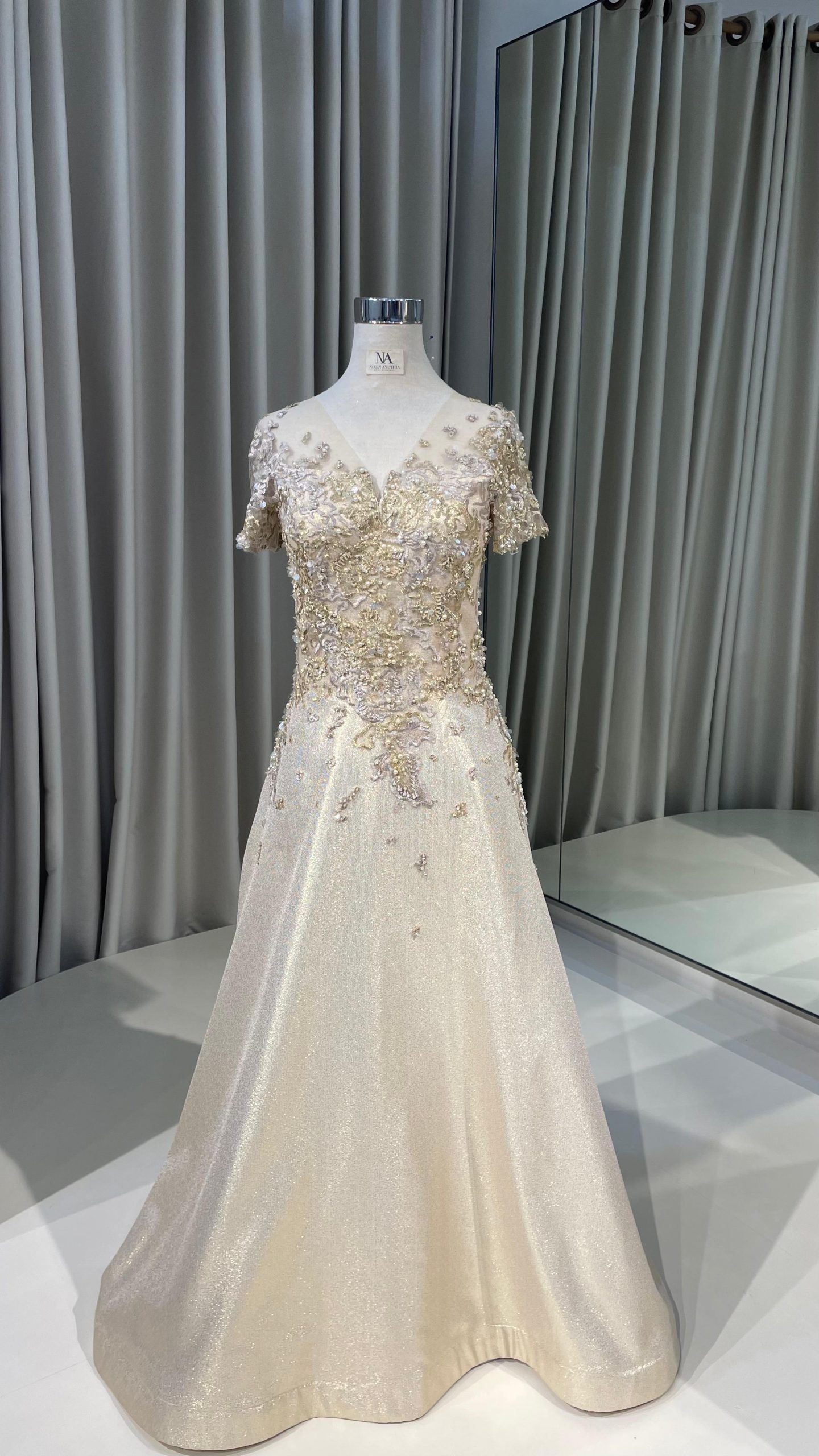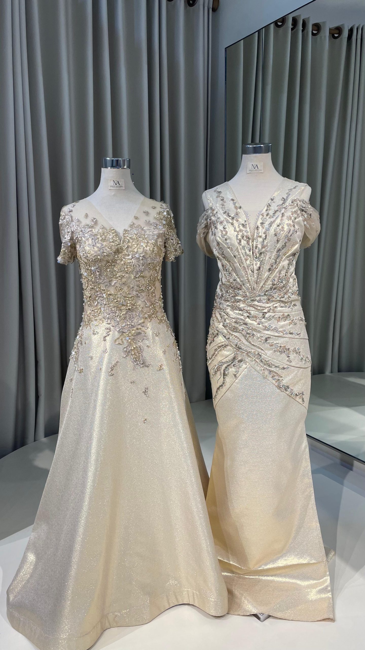 Champagne A-line dress with lace on upper part and short sleeves & Champagne H-line dress with lace on drapery and off shoulder sleeves.