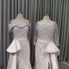 Champagne A-line dress with drapery on the waist & champagne A-line dress with off shoulder sleeves, drapery on the waist and front slit.
