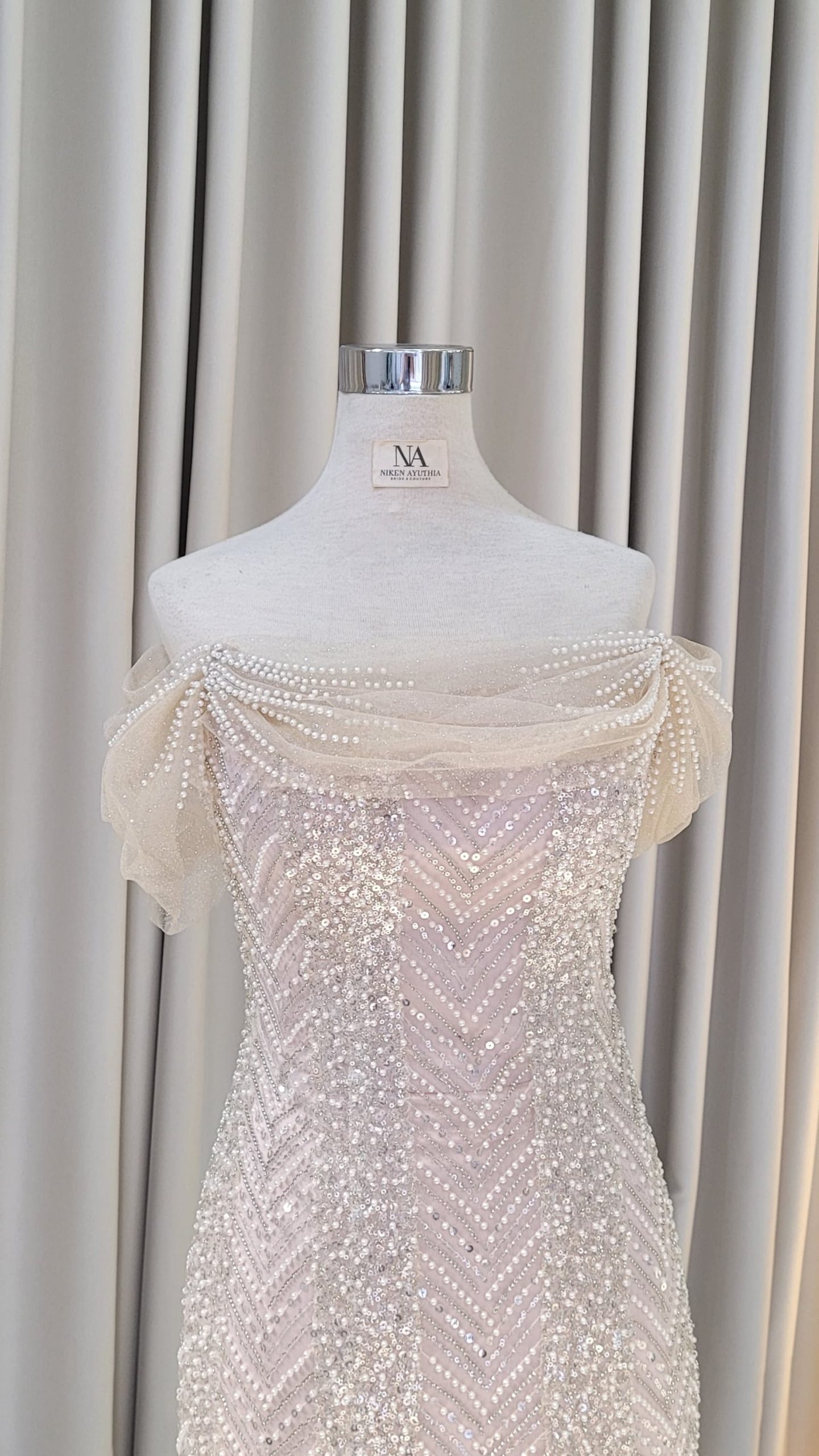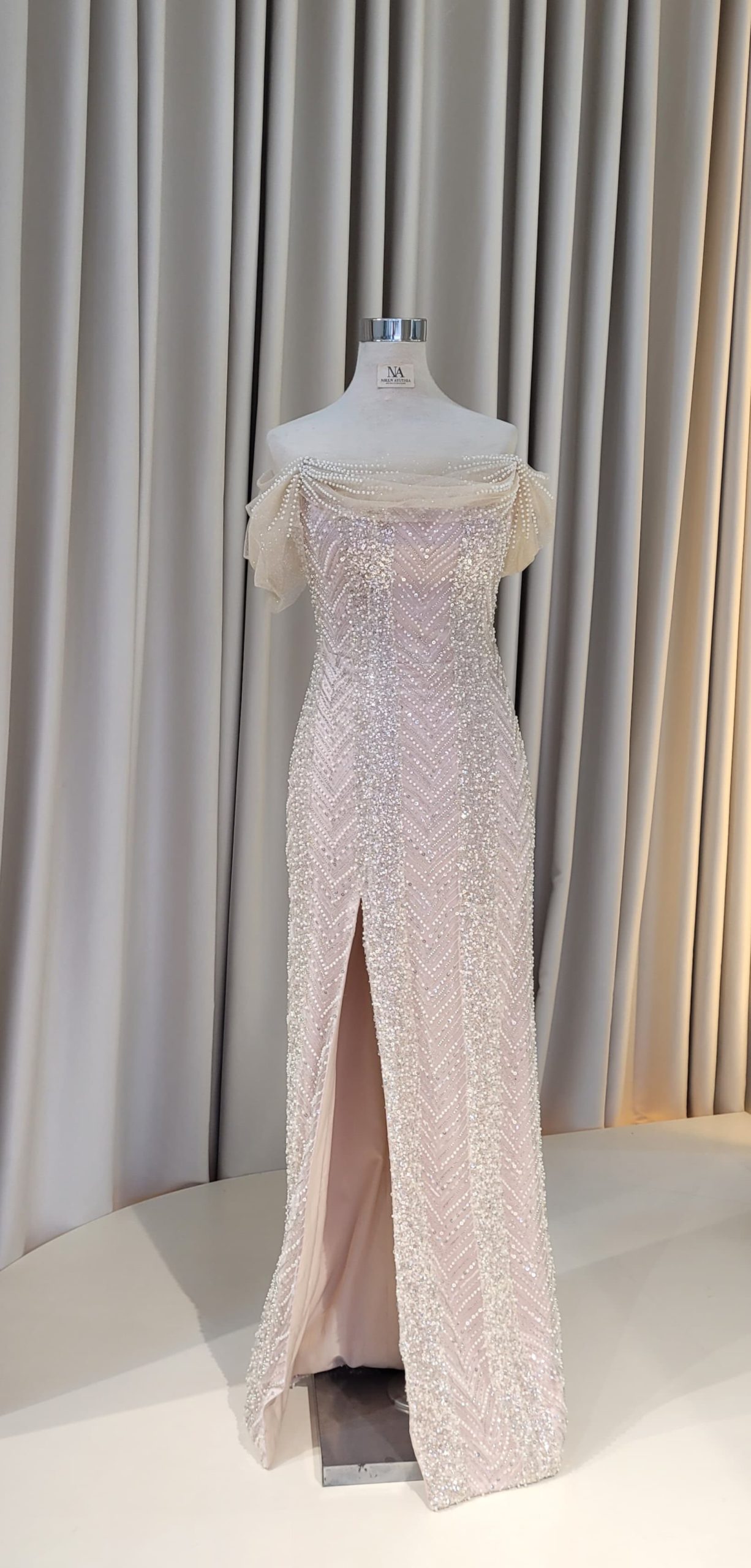 Full lace champagne H-line dress with glitter off shoulder and front slit