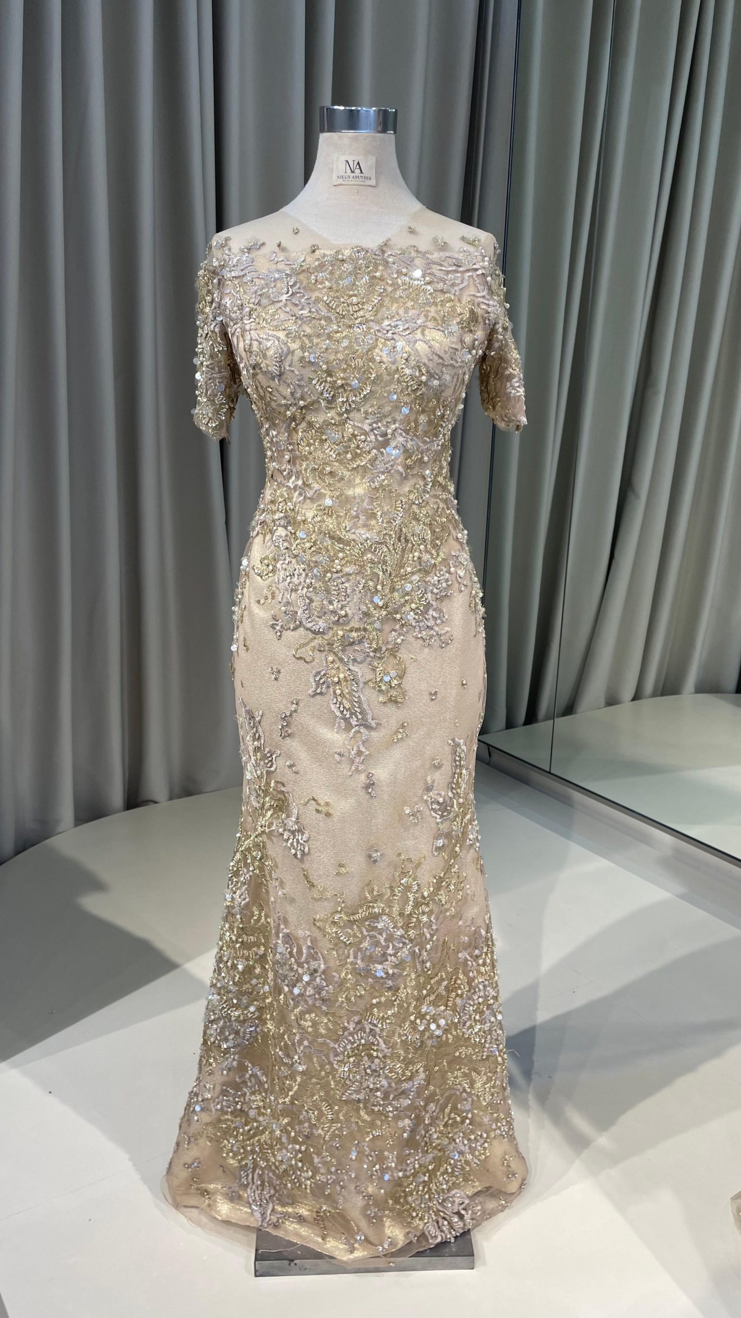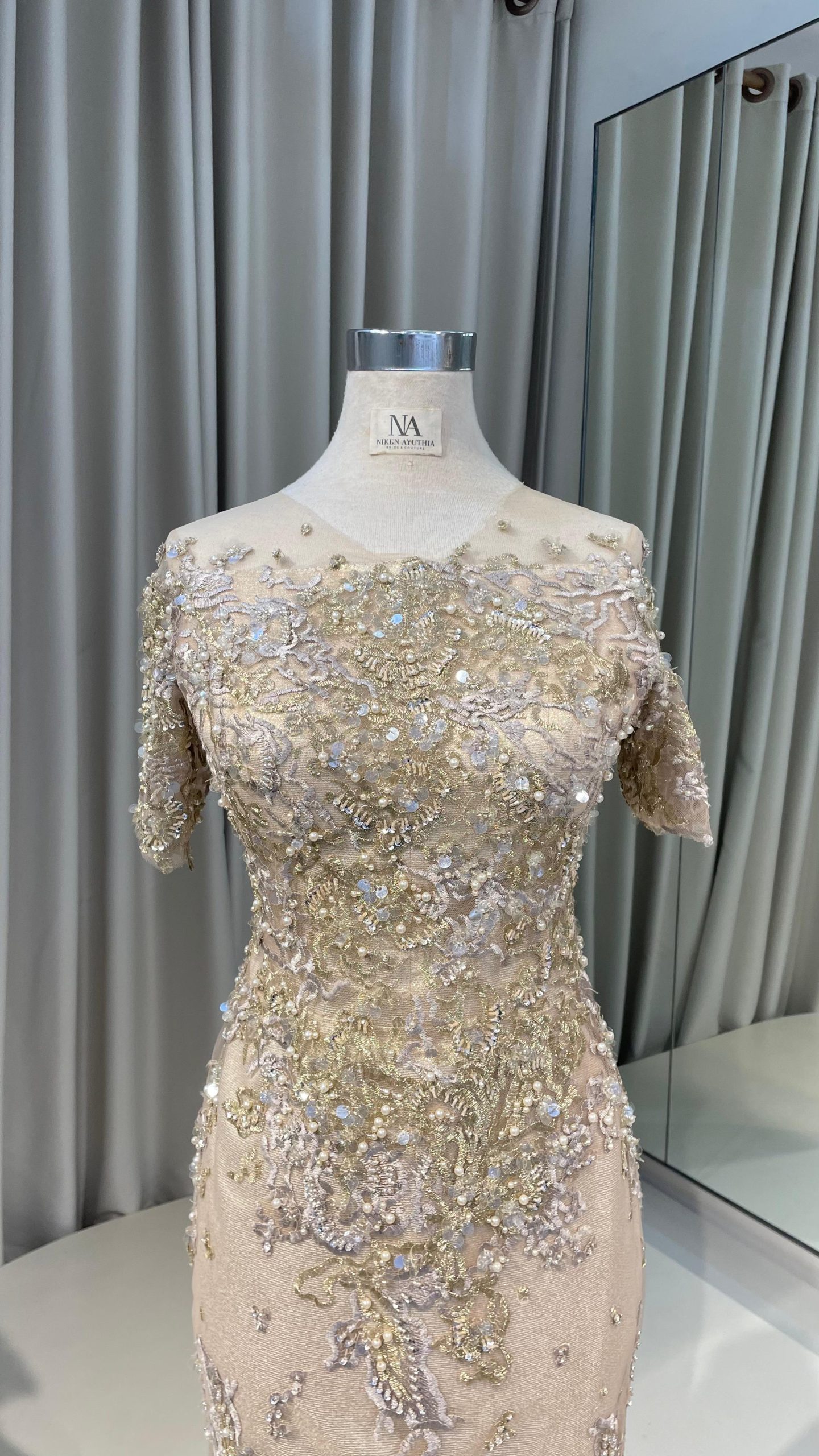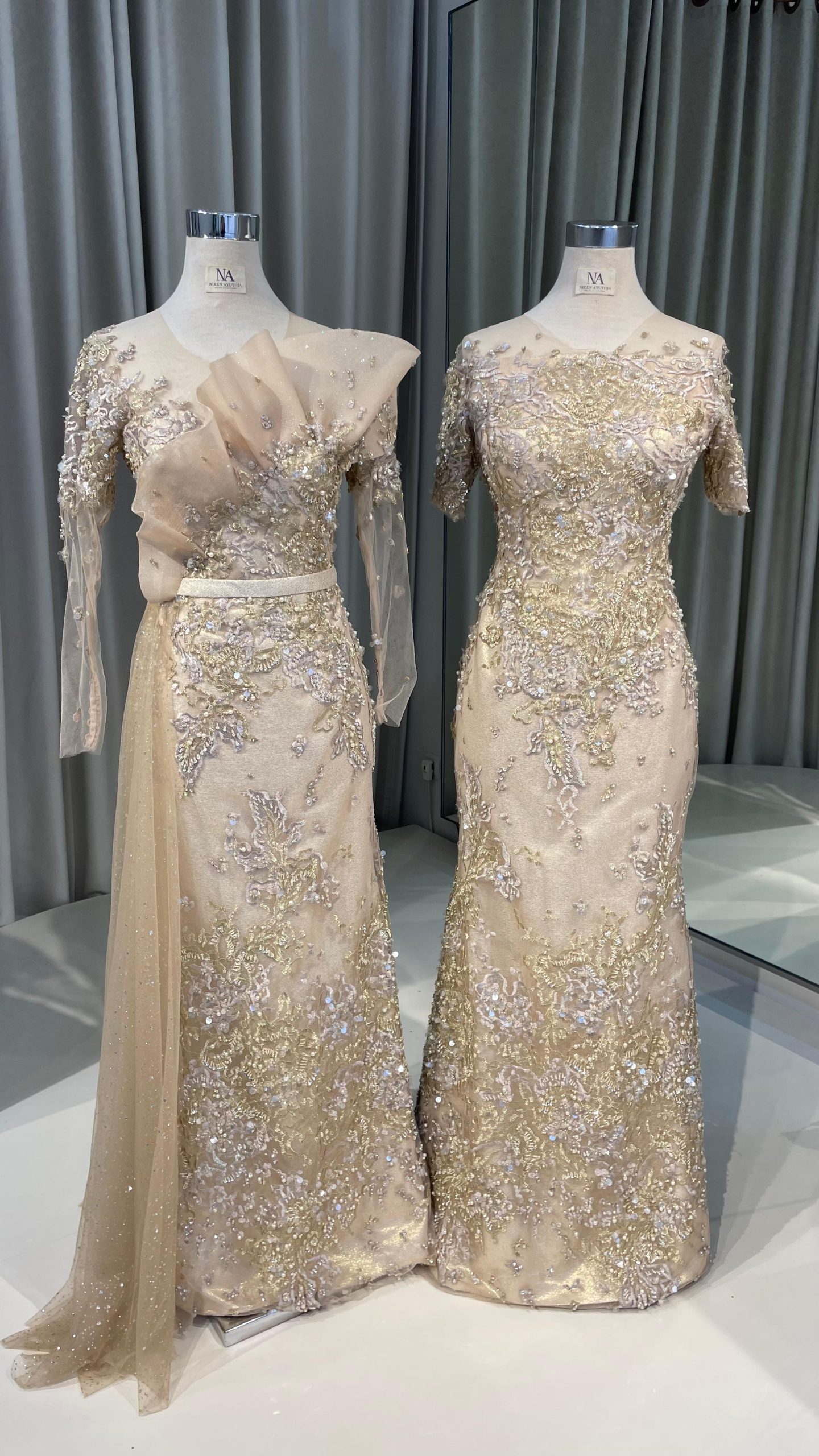 Full lace champagne mermaid dress with drapery on upper part and long sleeves & full lace champagne mermaid dress with short sleeves.