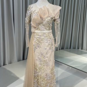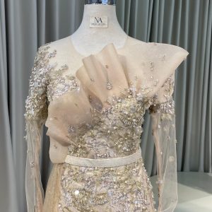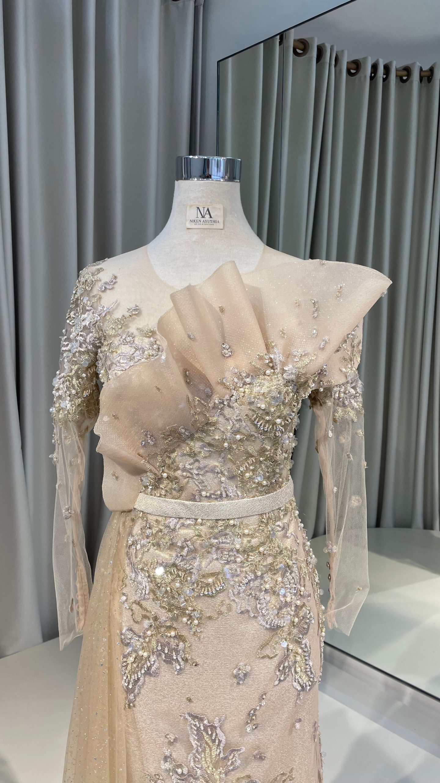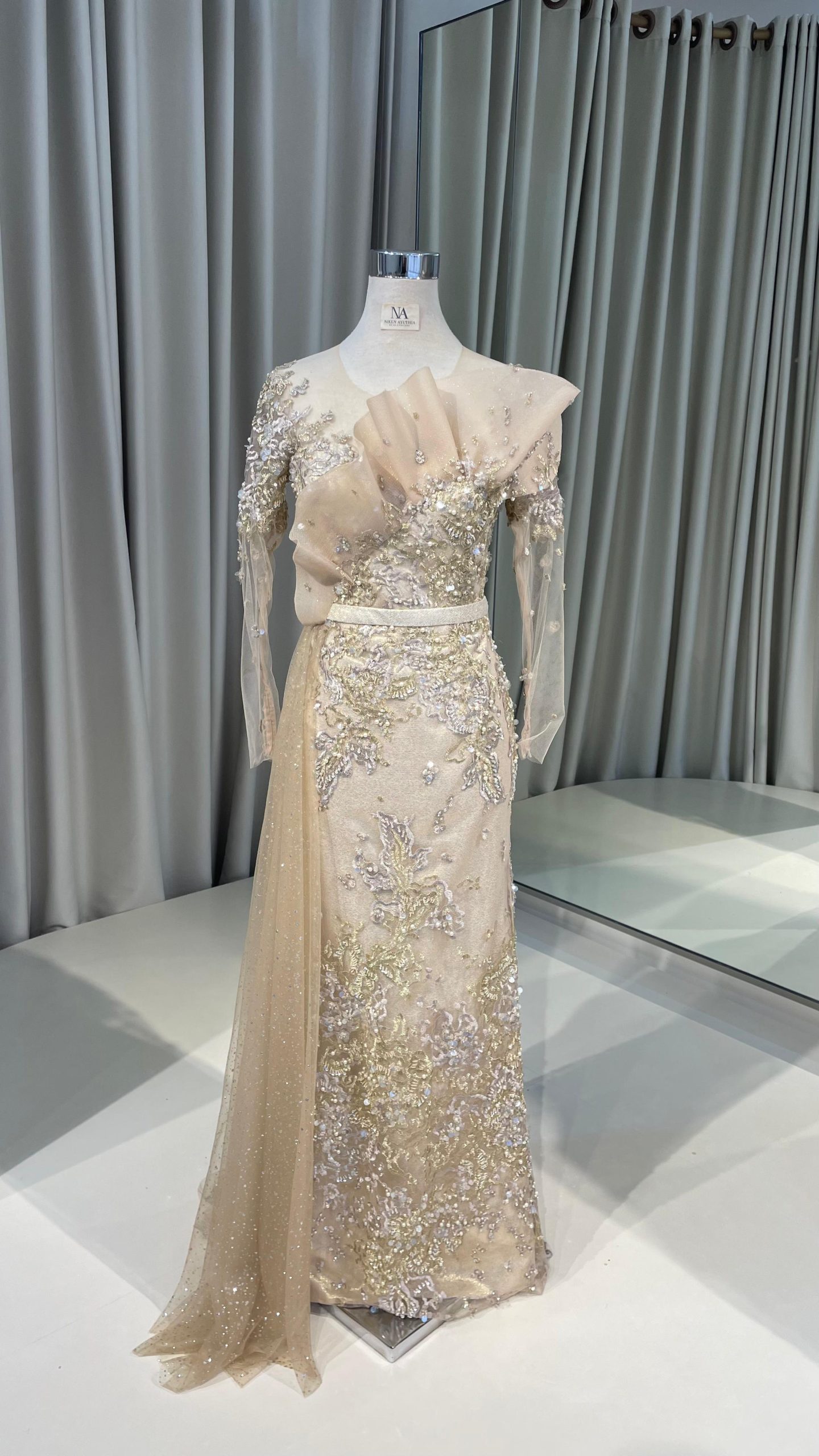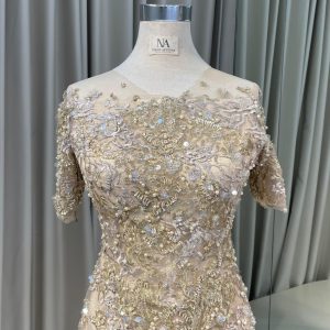 Full lace champagne mermaid dress with drapery on upper part and long sleeves & full lace champagne mermaid dress with short sleeves.