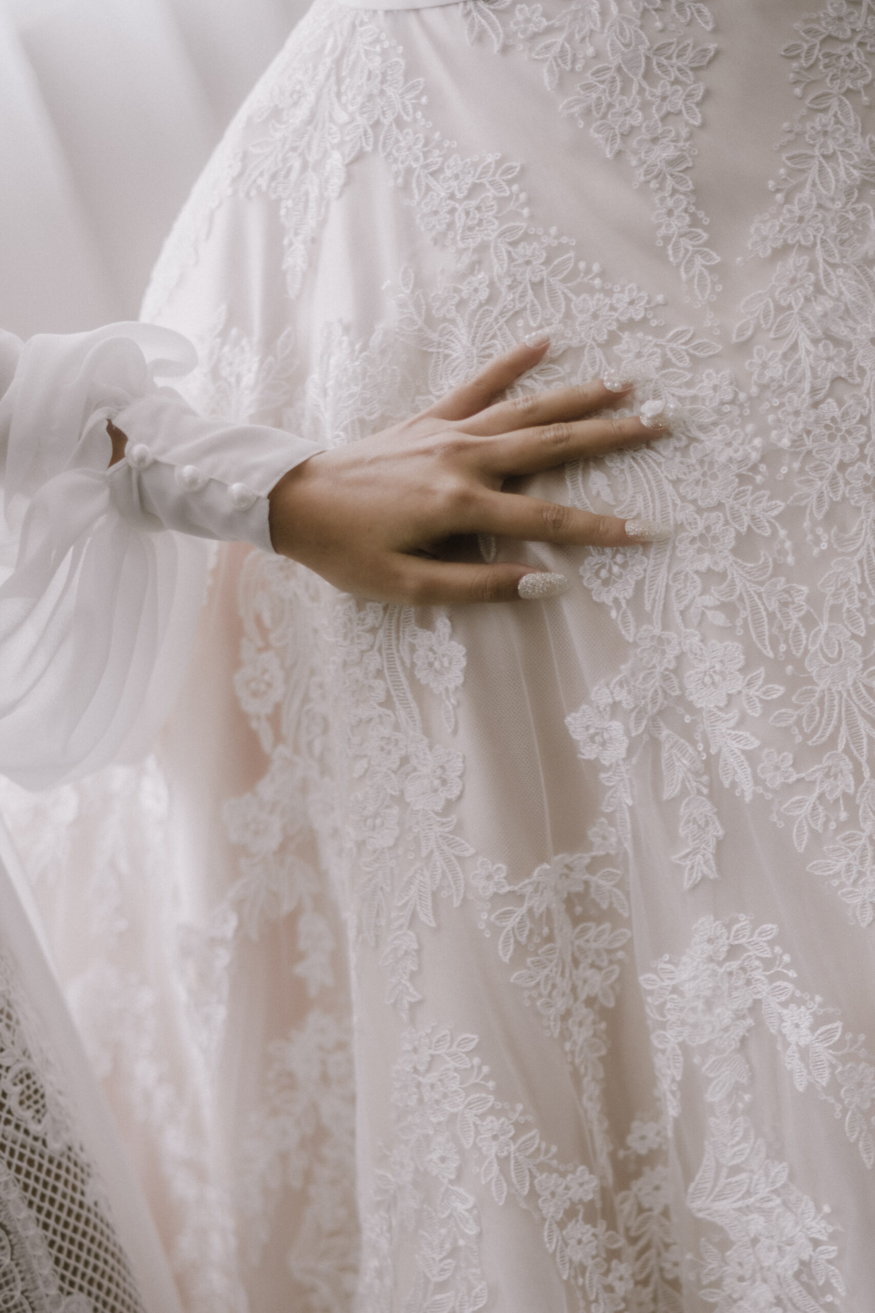 A nude ball gown adorned in timeless French lace exudes such elegance ready to accompany you during your most special day. Combine the dress with matching bolero or gloves to add more classic feeling.