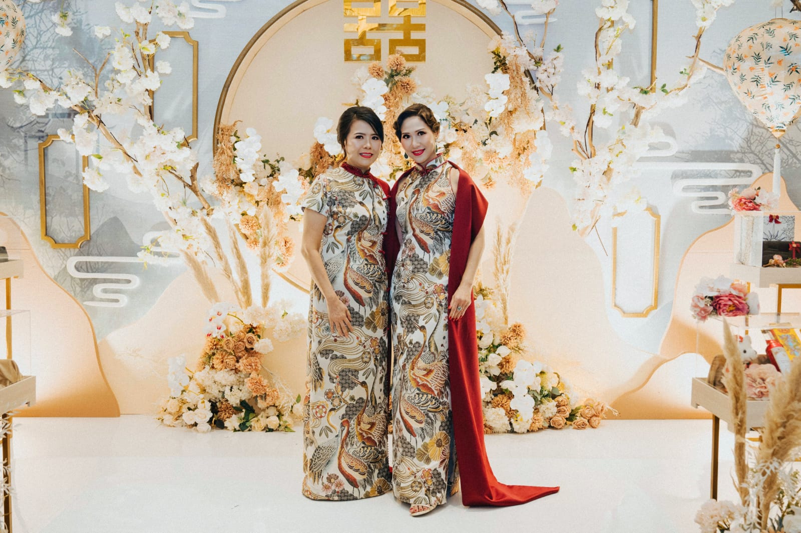 Full embroider cream halter neckline cheongsam with maroon shawl & full embroider cream cheongsam with short sleeves.