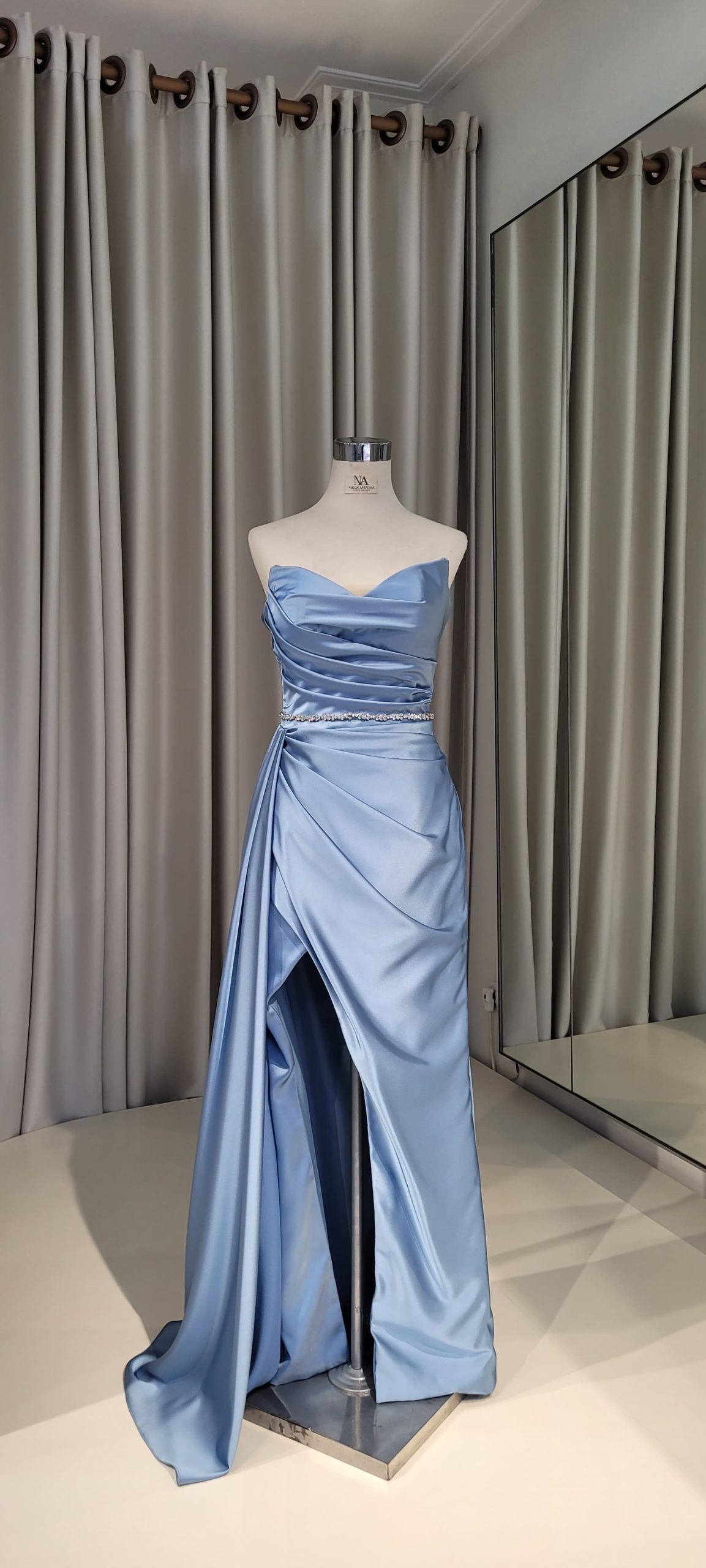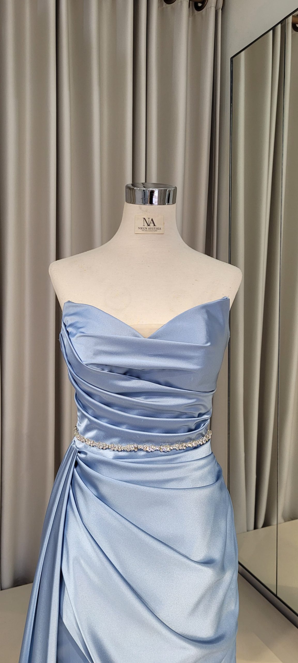Denim blue mermaid dress with drapery, Swarovski details on the waist and front slit.