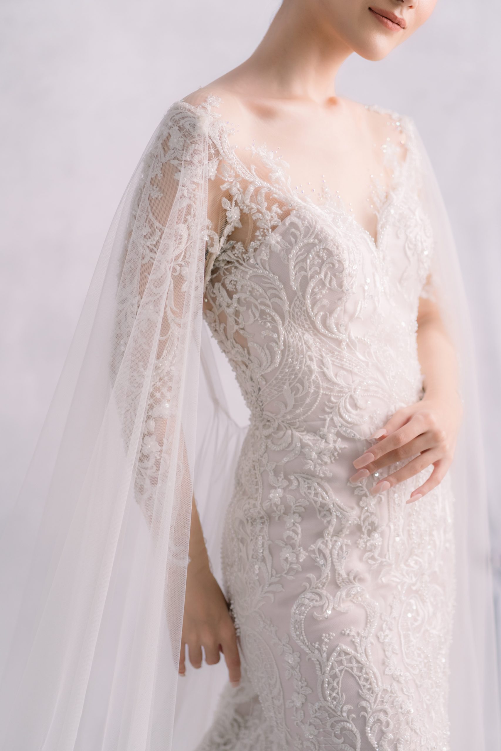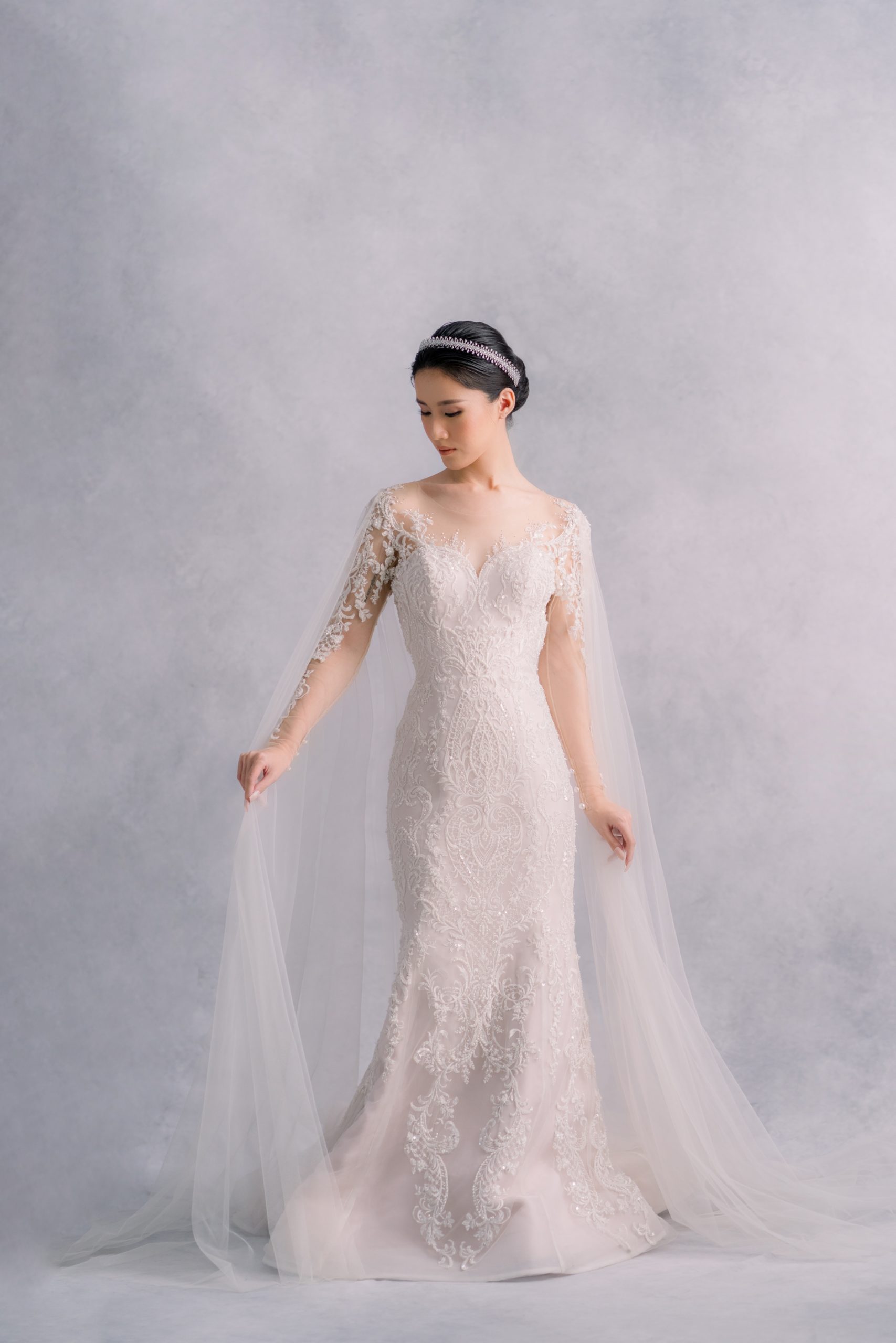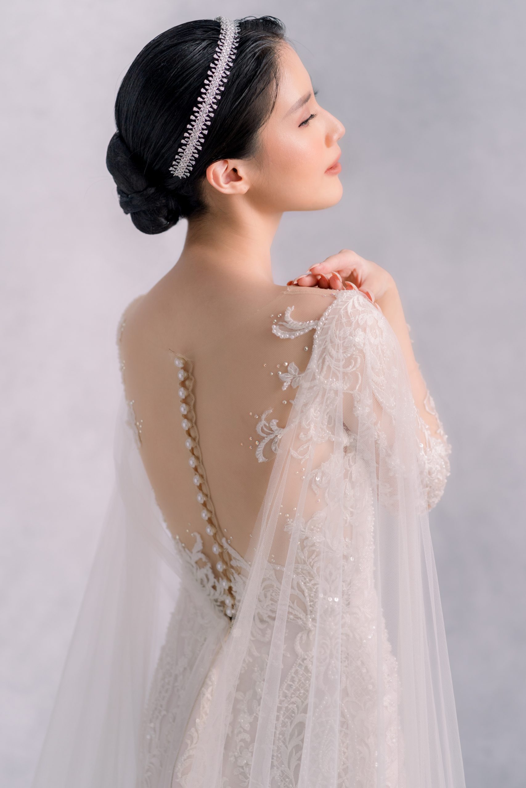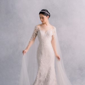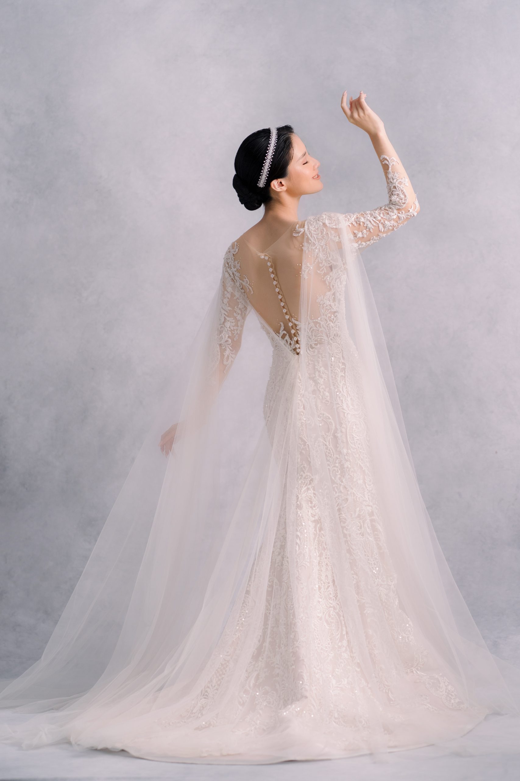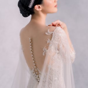 Who doesnt love low back dress?! This long sleeve dress is super elegant and is definitely one of our favorite. Those tulle robe can be easily attached or detached within a few second, creating another look for your reception party