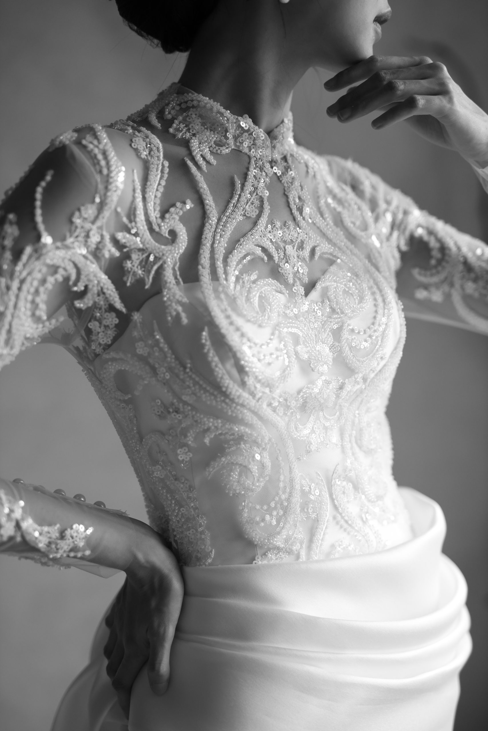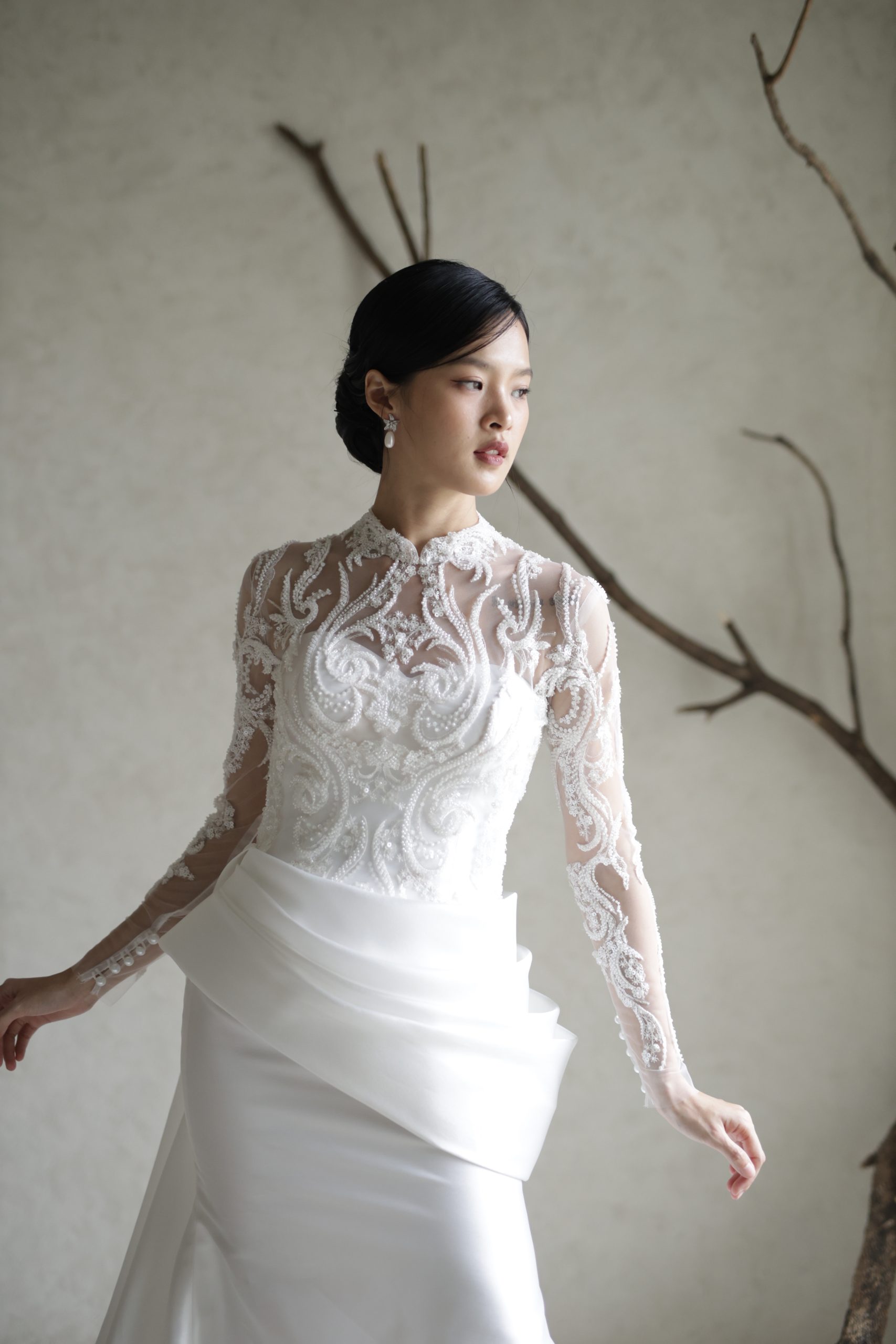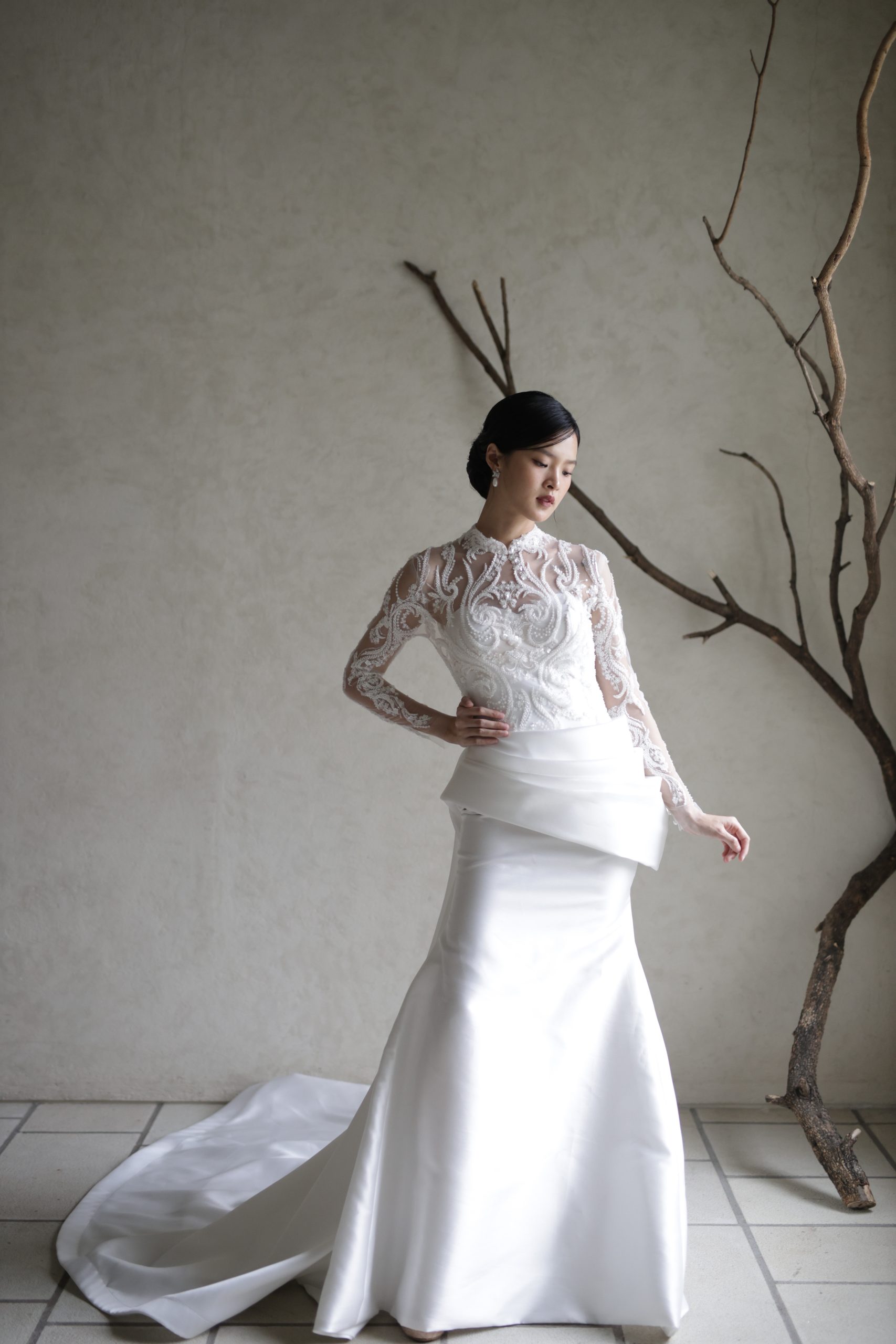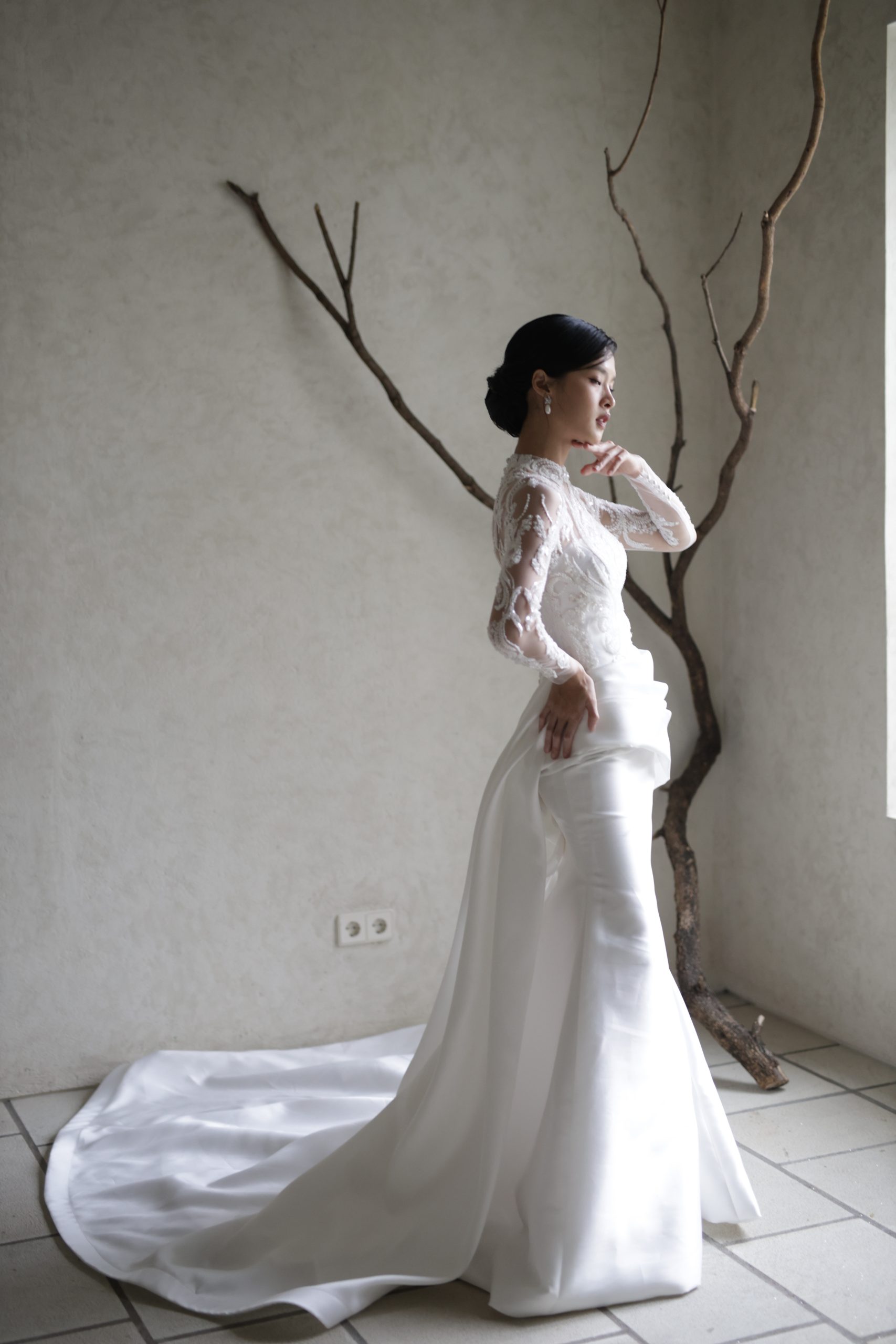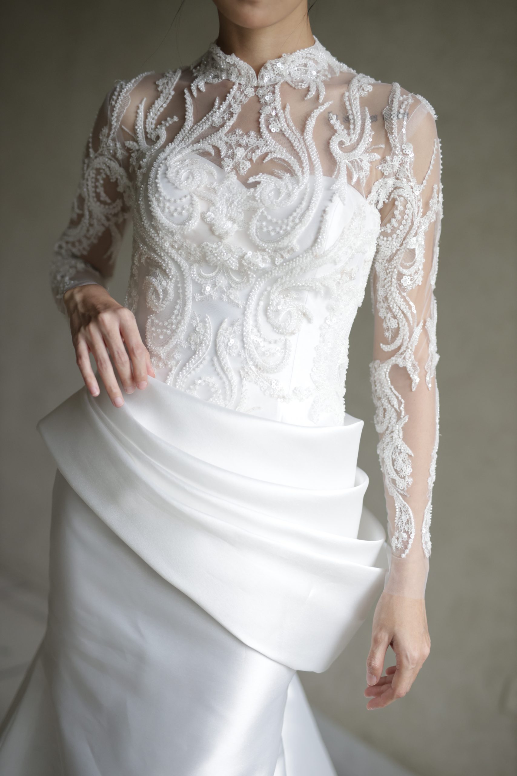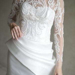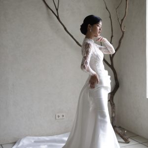Enchanting mermaid silhouette wedding dress– the perfect blend of elegance and comfort. Crafted from lightweight satin with exquisite drapery, this gown flows beautifully as you dance the night away. Featuring a heart-shaped neckline and bolero, it’s designed for the modern bride seeking intimacy and sophistication.