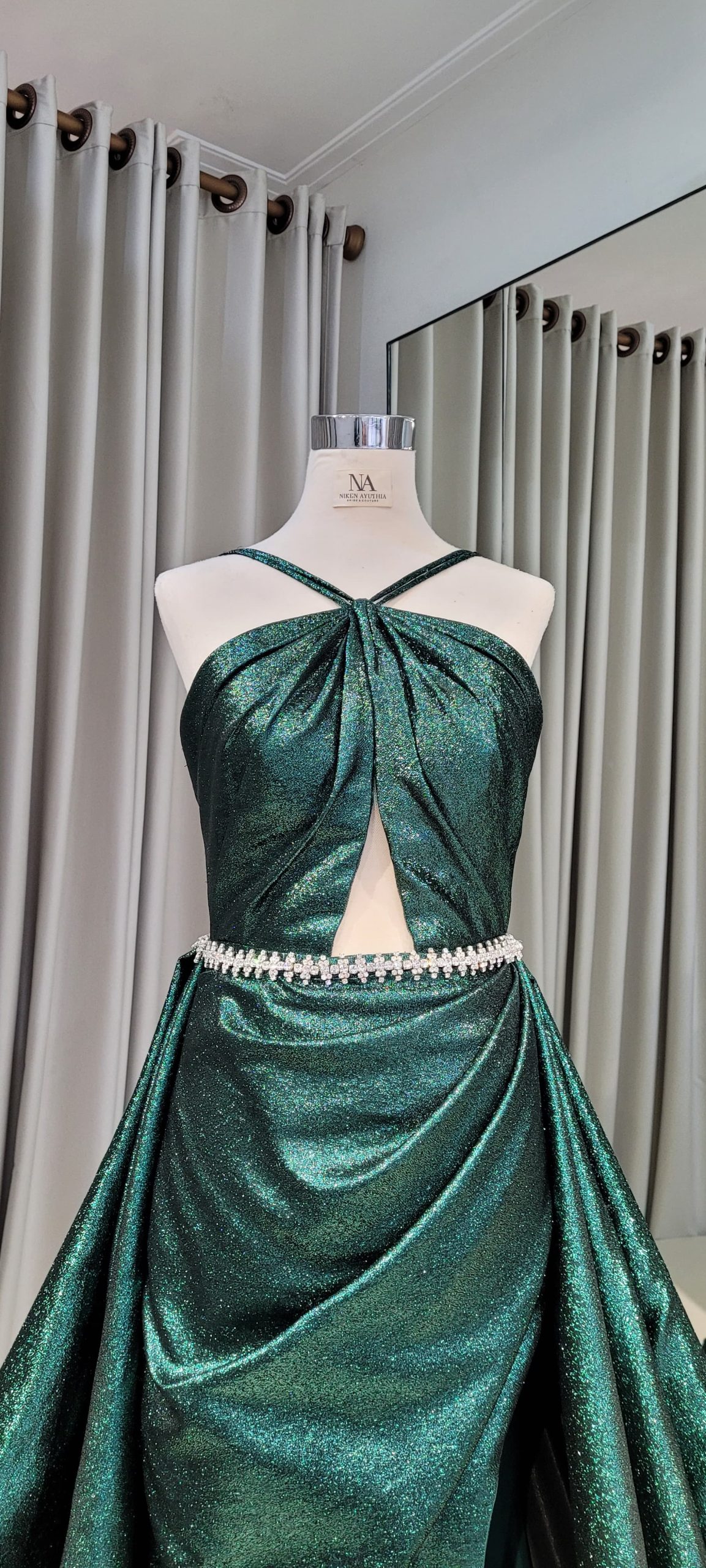 Emerald green mermaid dress with halter neckline, front slit, and train.