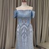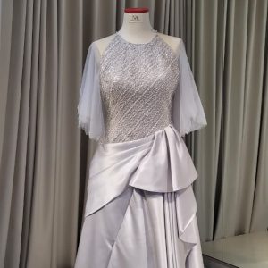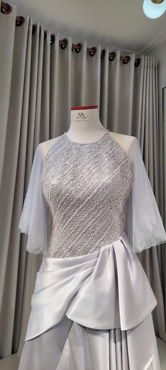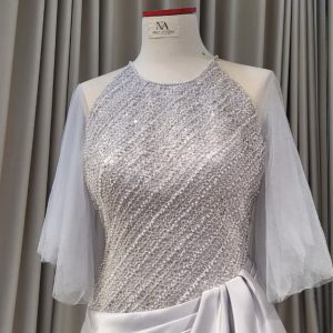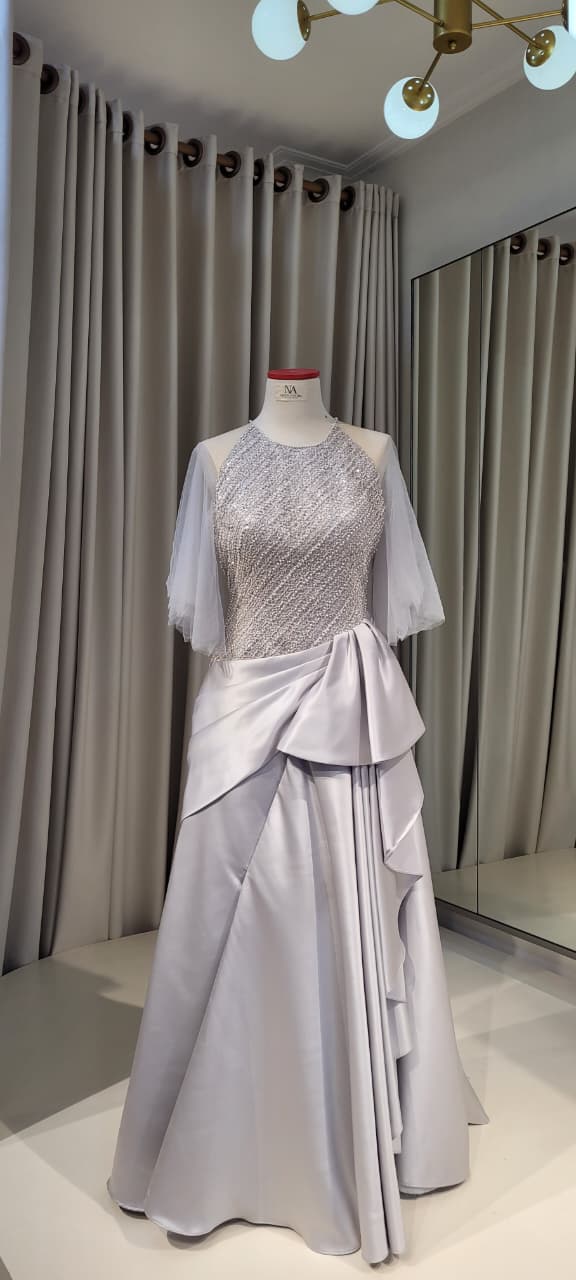 Grey A-line dress with lace on upper part, tulle sleeves and drapery.