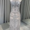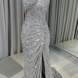Full lace grey mermaid dress with one shoulder, cut out at the front, and front slit.