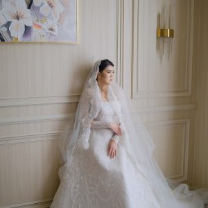 A classic A-line gown paired with a structured lace bolero that creates a refined, timeless look. The mantilla-style veil completes the ensemble with soft elegance and a cohesive finish, perfectly suited for a holy ceremony.