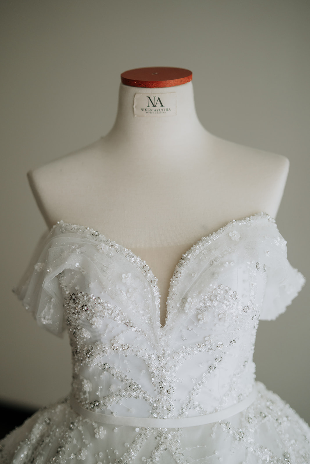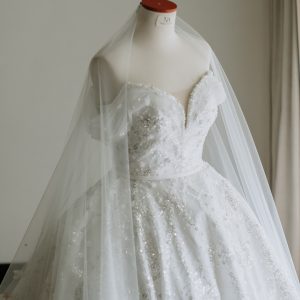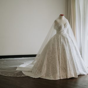 Be timeless in this sparkling ball gown dress with geometrical flower petals pattern for your big day. Change the look with our various matching bolero or off shoulder selections, each can be worn for holy matrimony, tea ceremony and reception session.