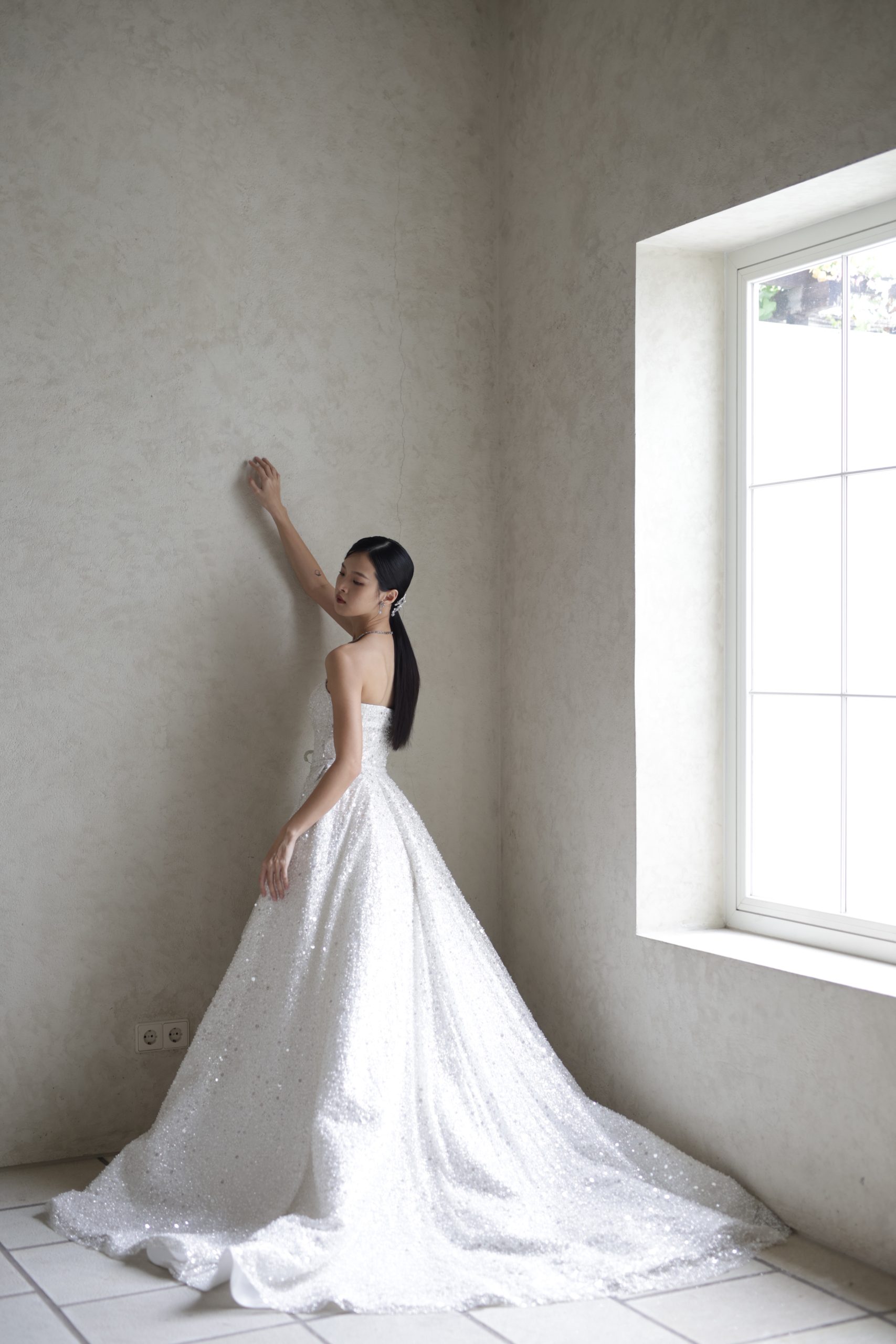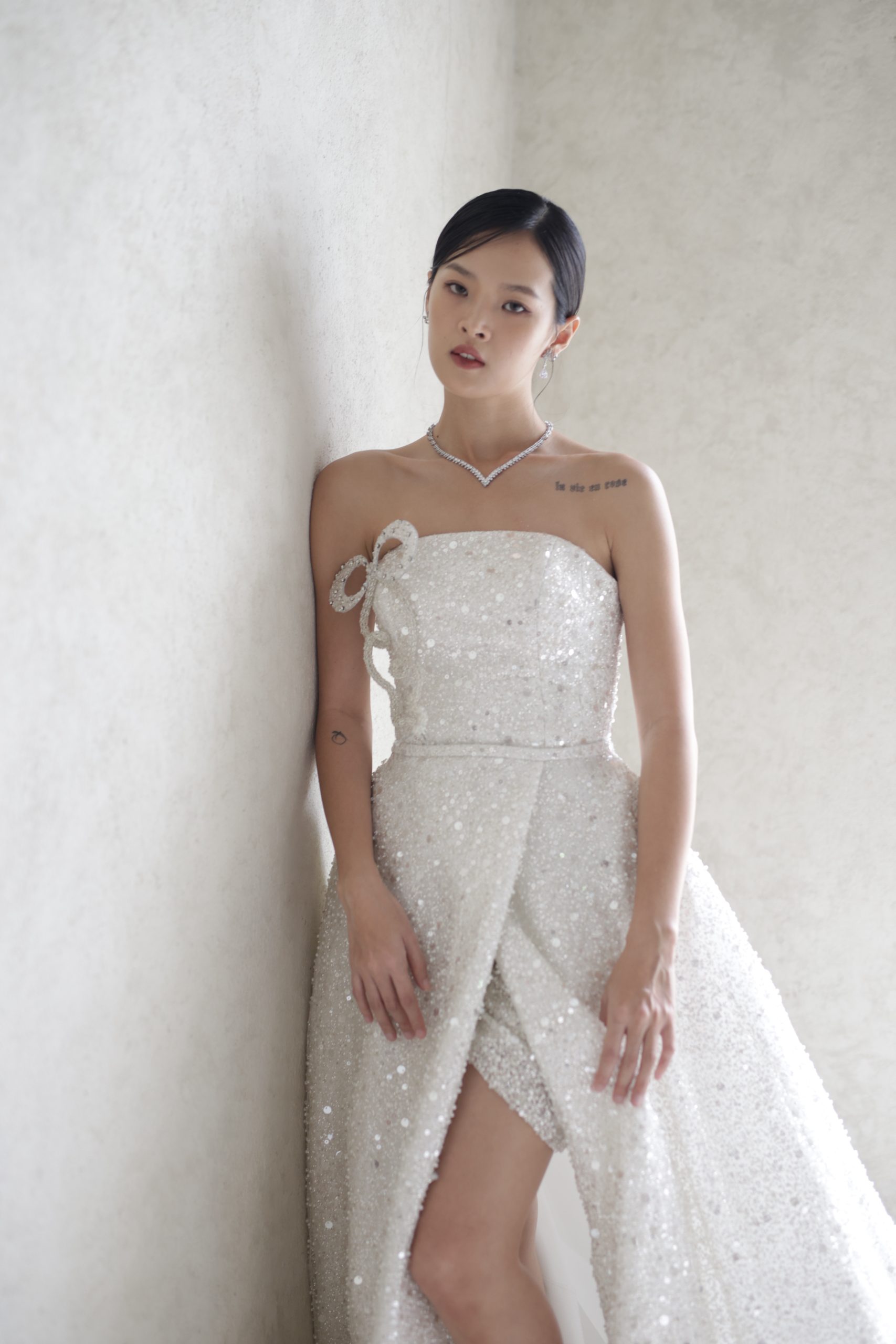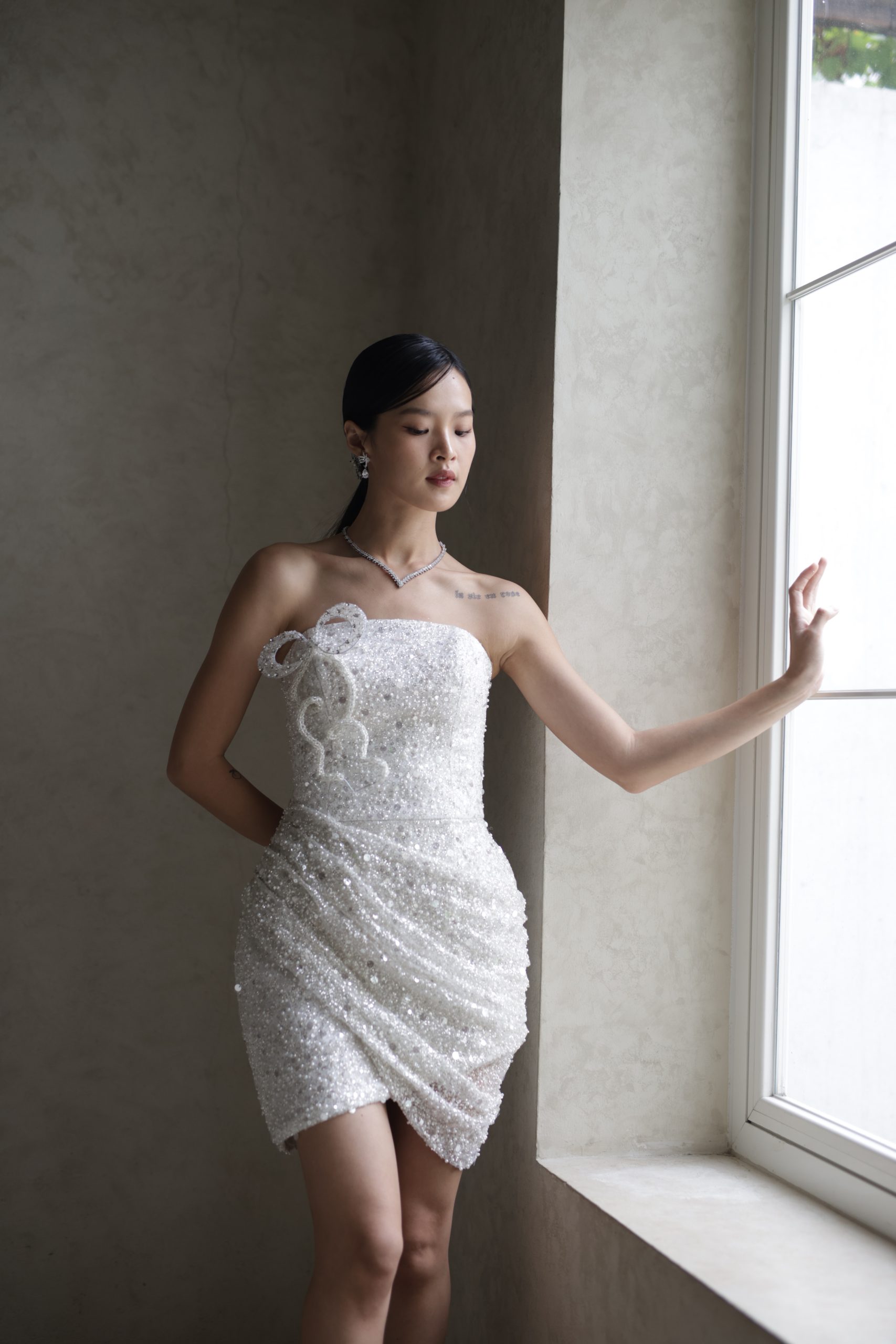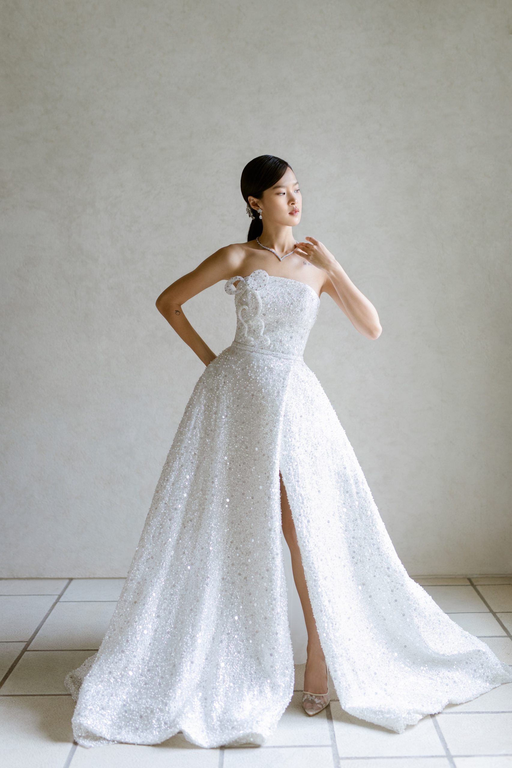 Versatile, elegant and designed to dazzle! Wear it as a glamourous A-line gown or short and chic for your after-party. Customizable to your preferences : add sleeves, go off shoulder or make it uniquely yours.