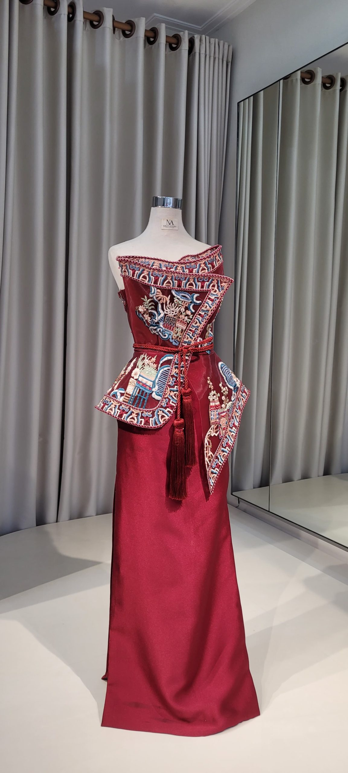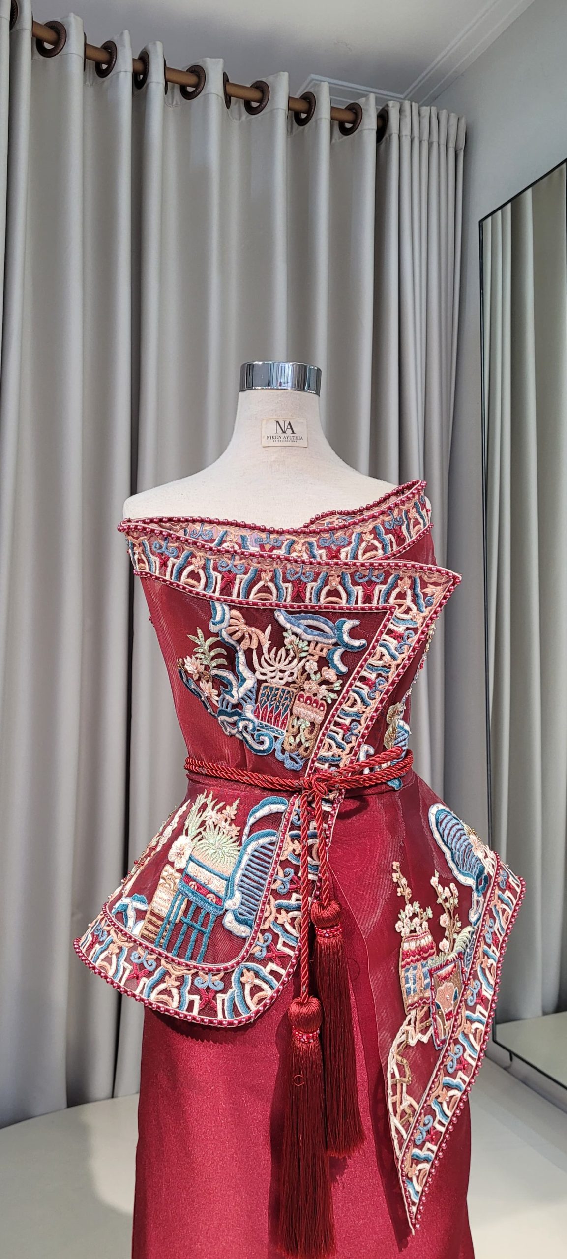 The dress will be resized according to client’s size (it can be altered from XS – M). Accessories (chinese fan, belt, and hair pin) are not included
