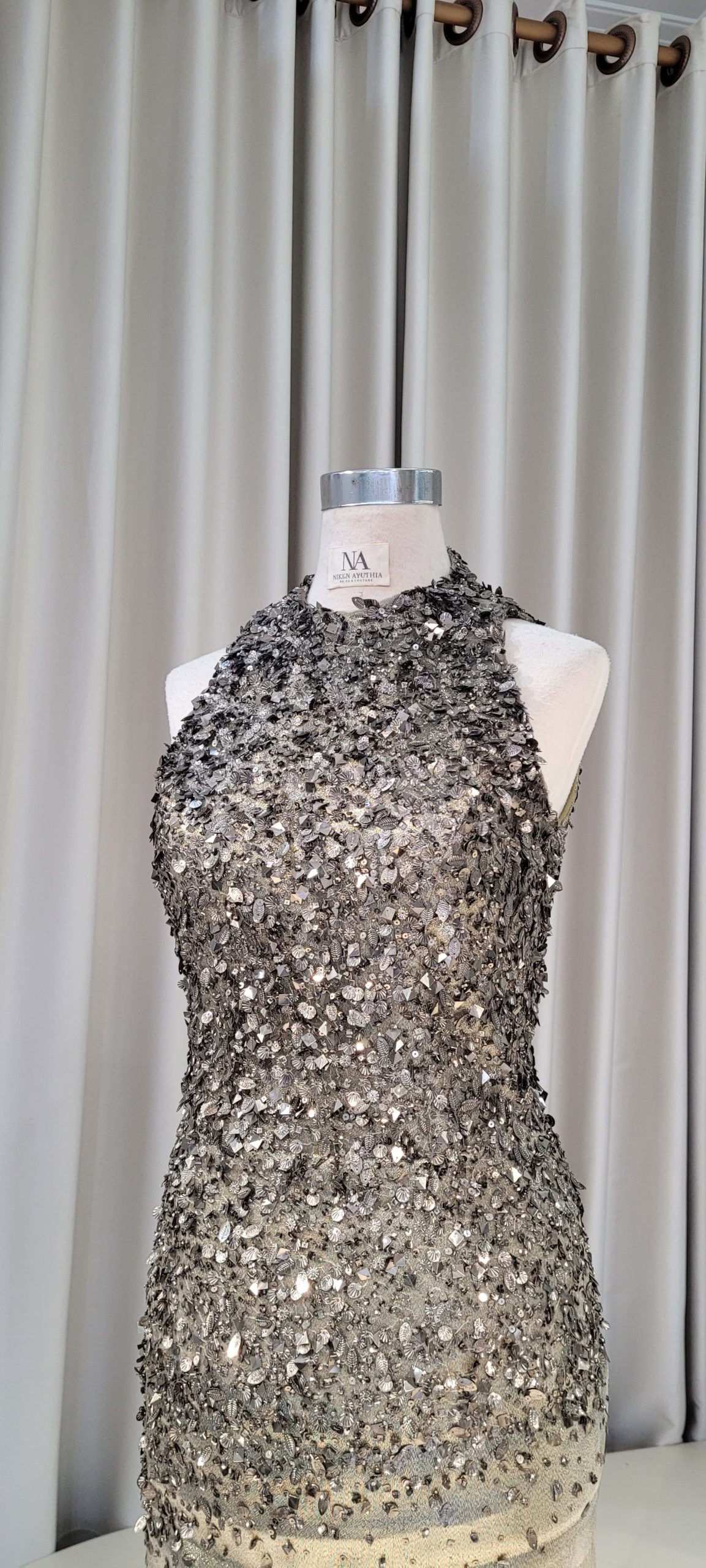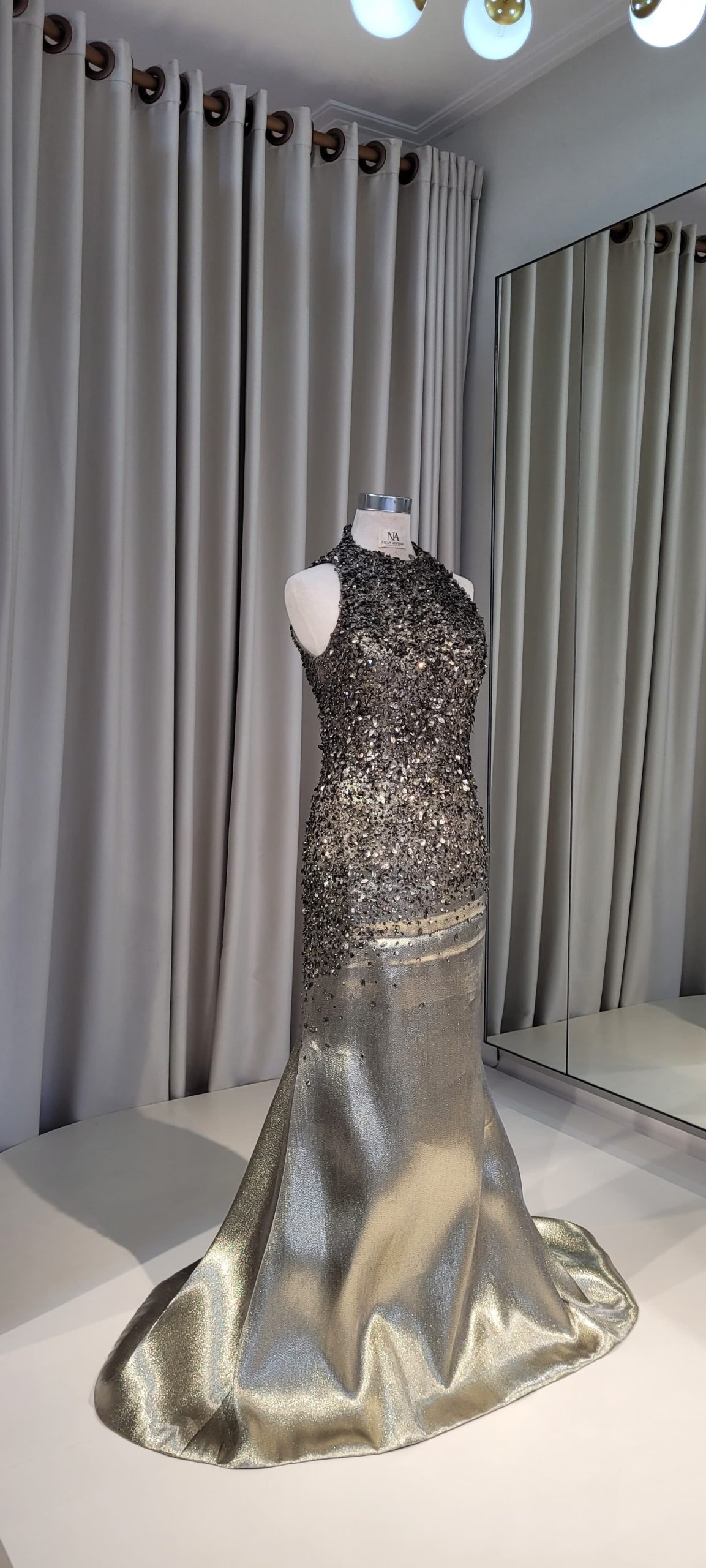 Olive mermaid dress with halter neckline and 3D lace on upper part.