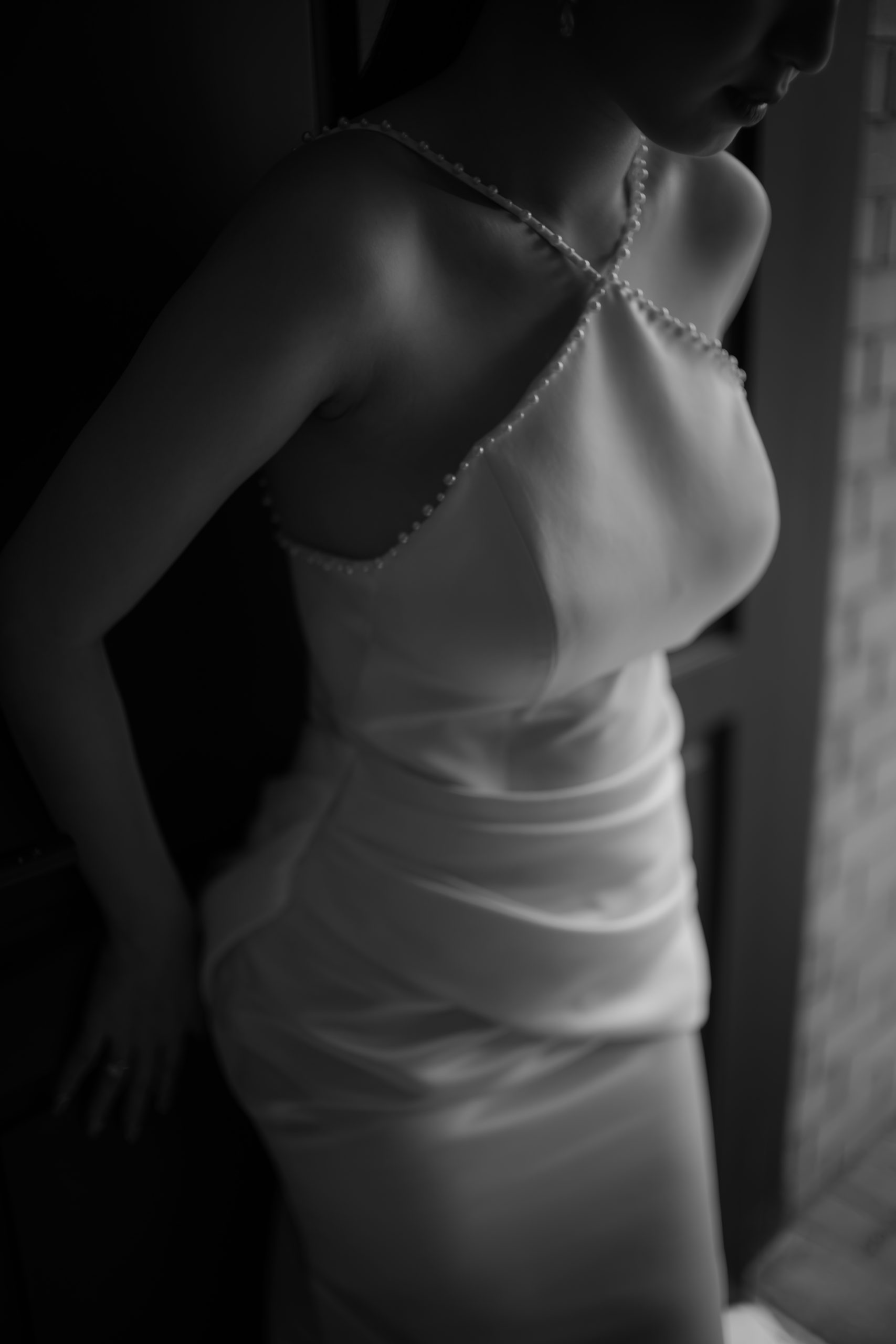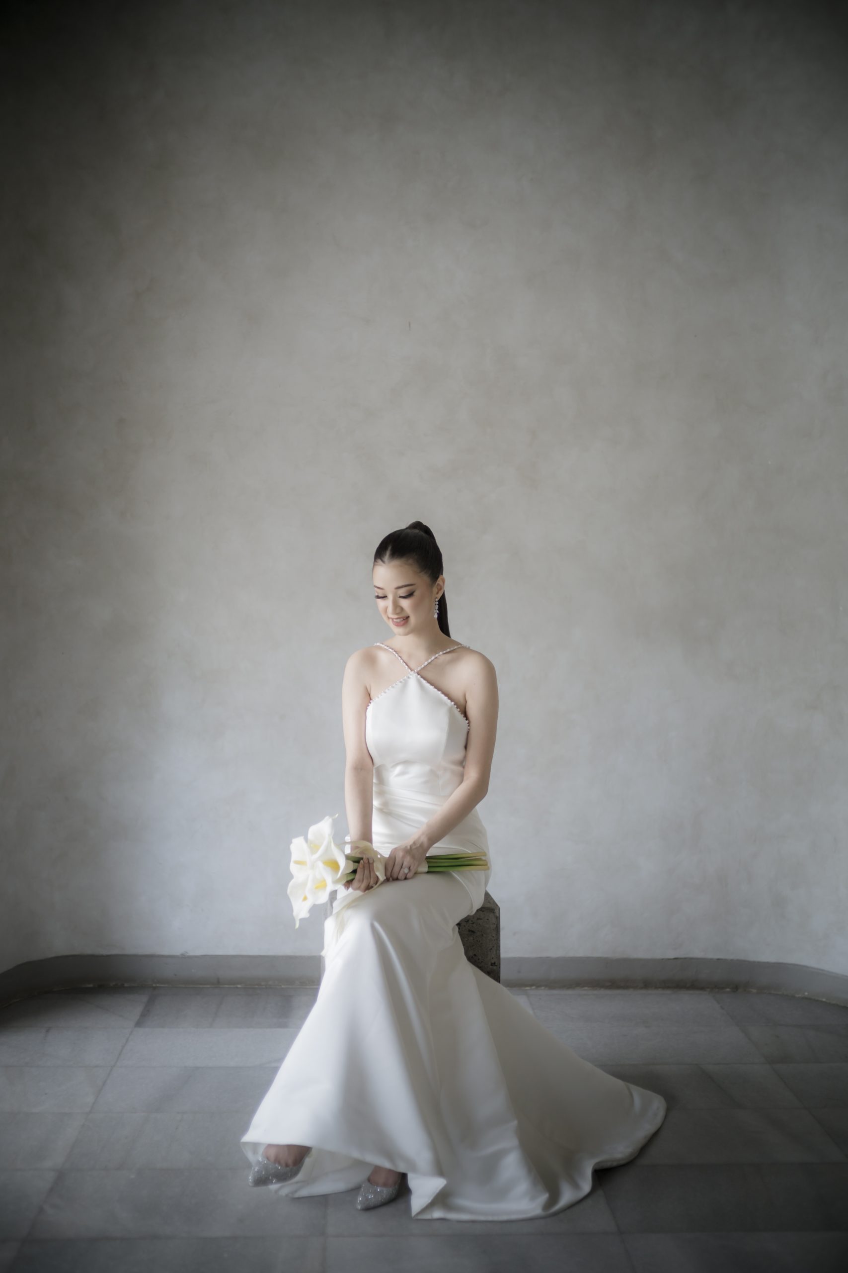 Halter neck mermaid dress with pearl detail on top and drapery around the waist. Suitable for those who look for simple and elegant dress.