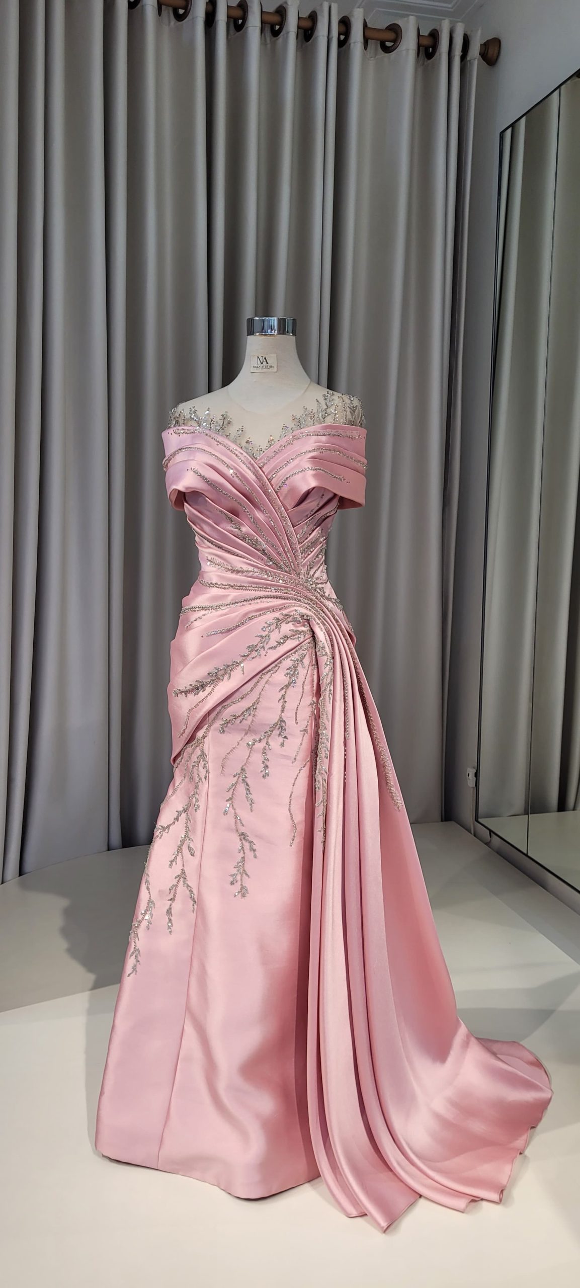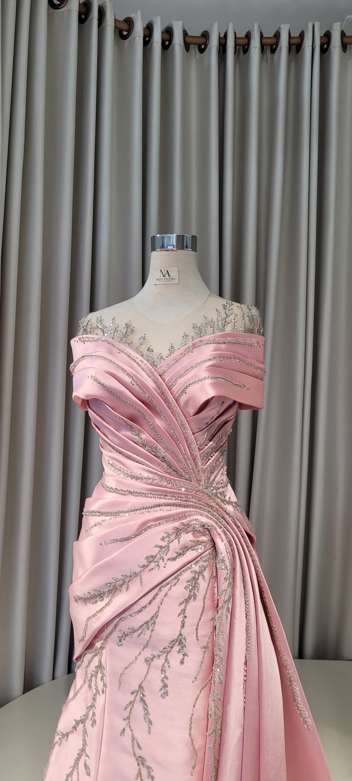 Pink mermaid dress with off shoulder sleeves, lace on upper part and drapery on the waist.
