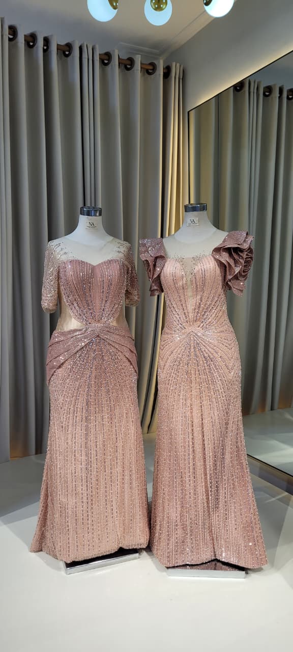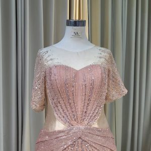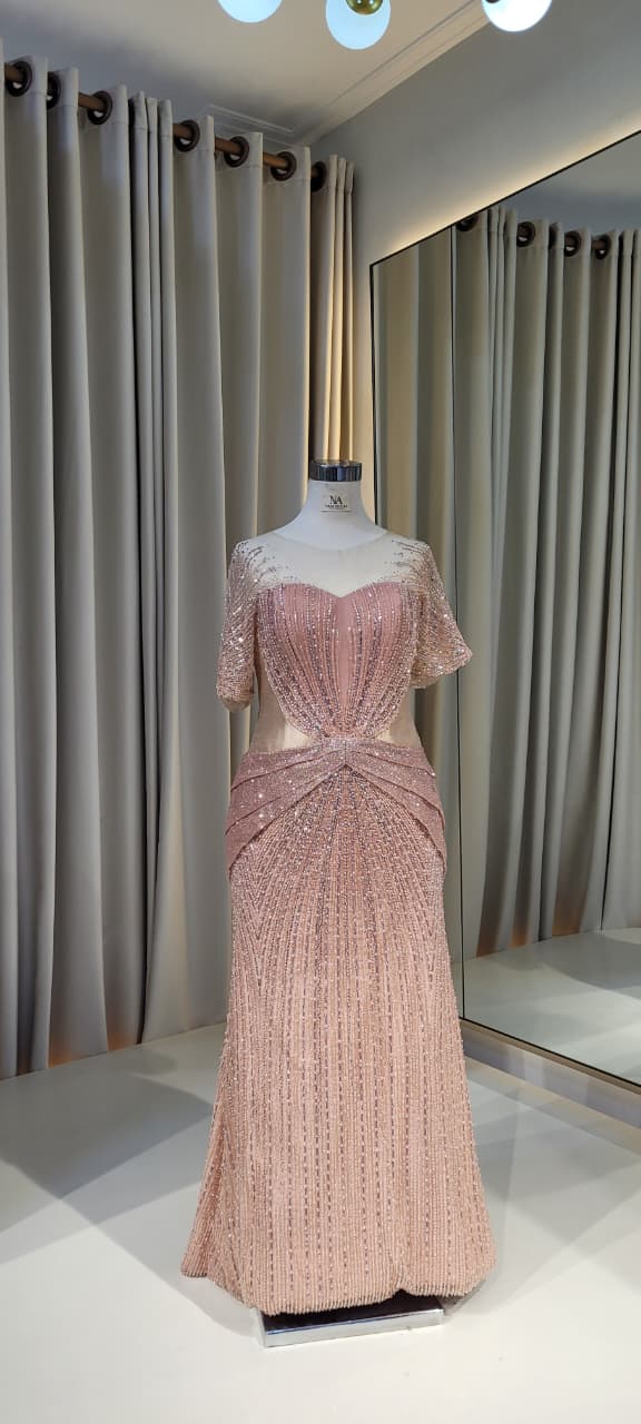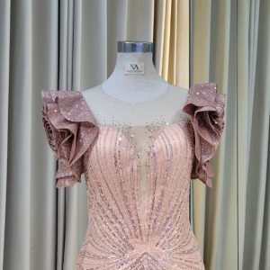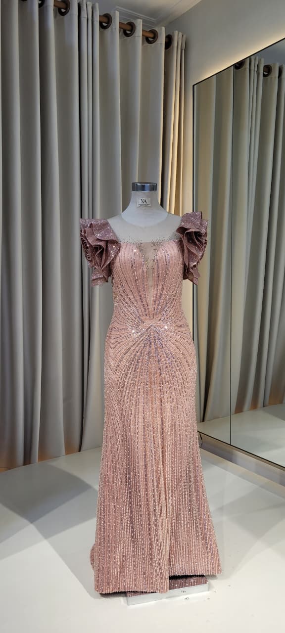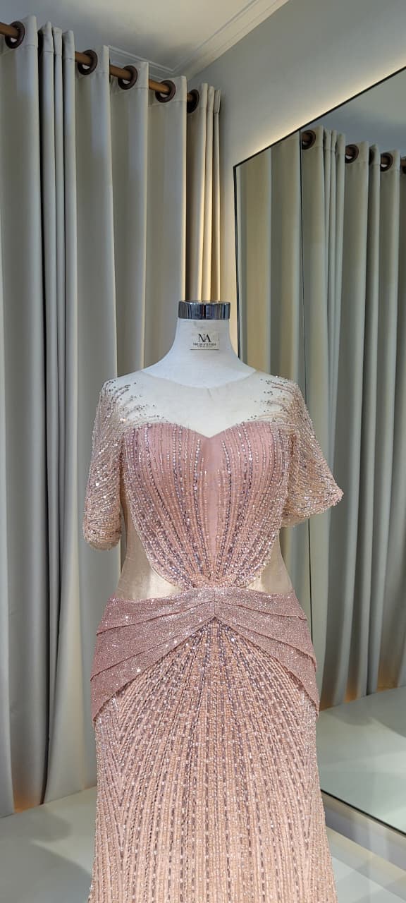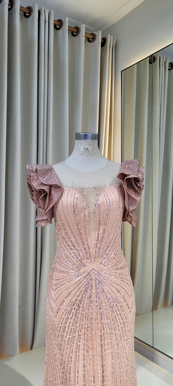 - Full lace rose gold mermaid dress with glitter drapery, side cut out and sleeves.