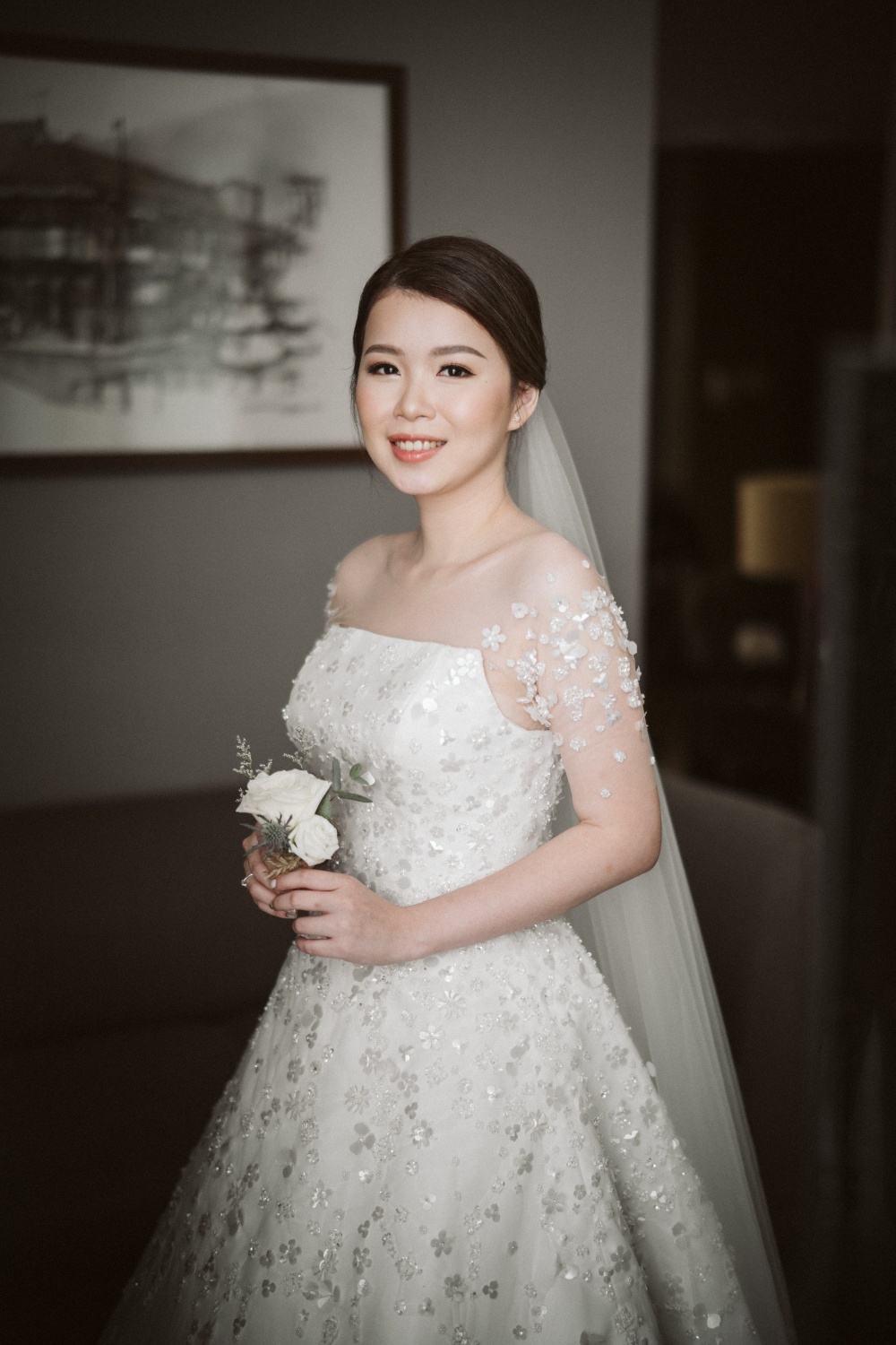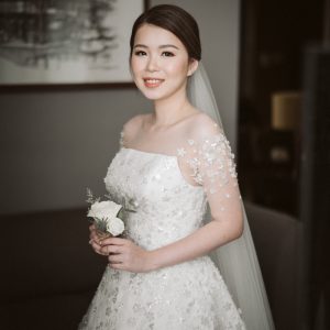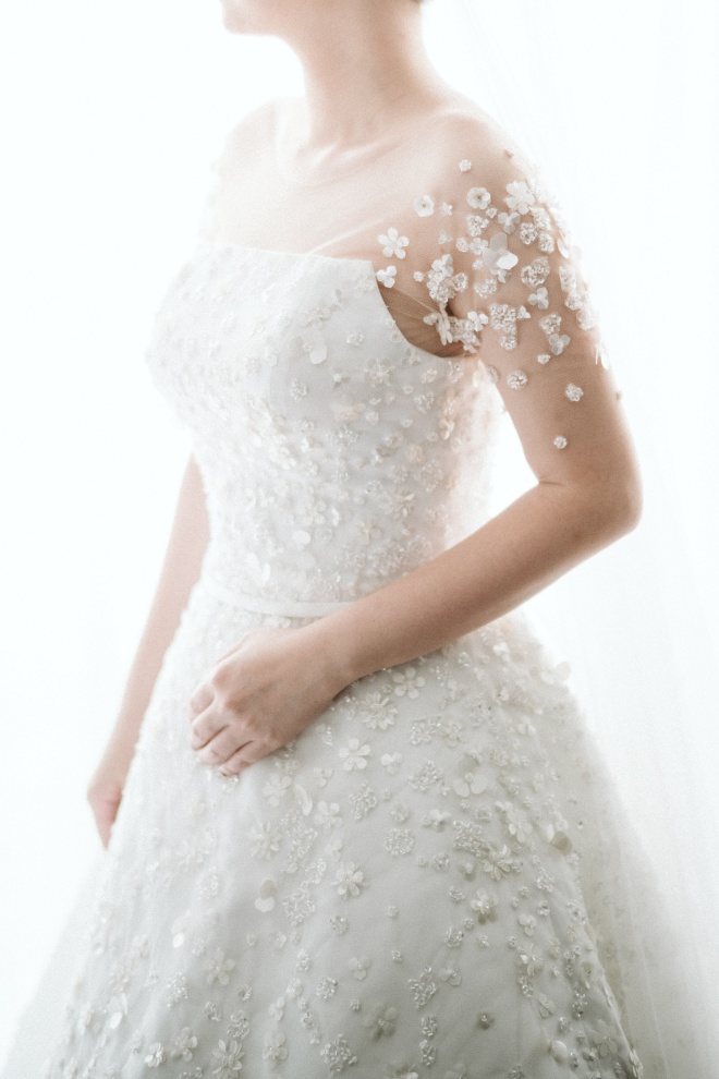 A line or semi ballgown wedding dress with delicate flower details. This wedding dress can be paired with detachable bolero or off shoulder that can be customized to perfectly fit your body.