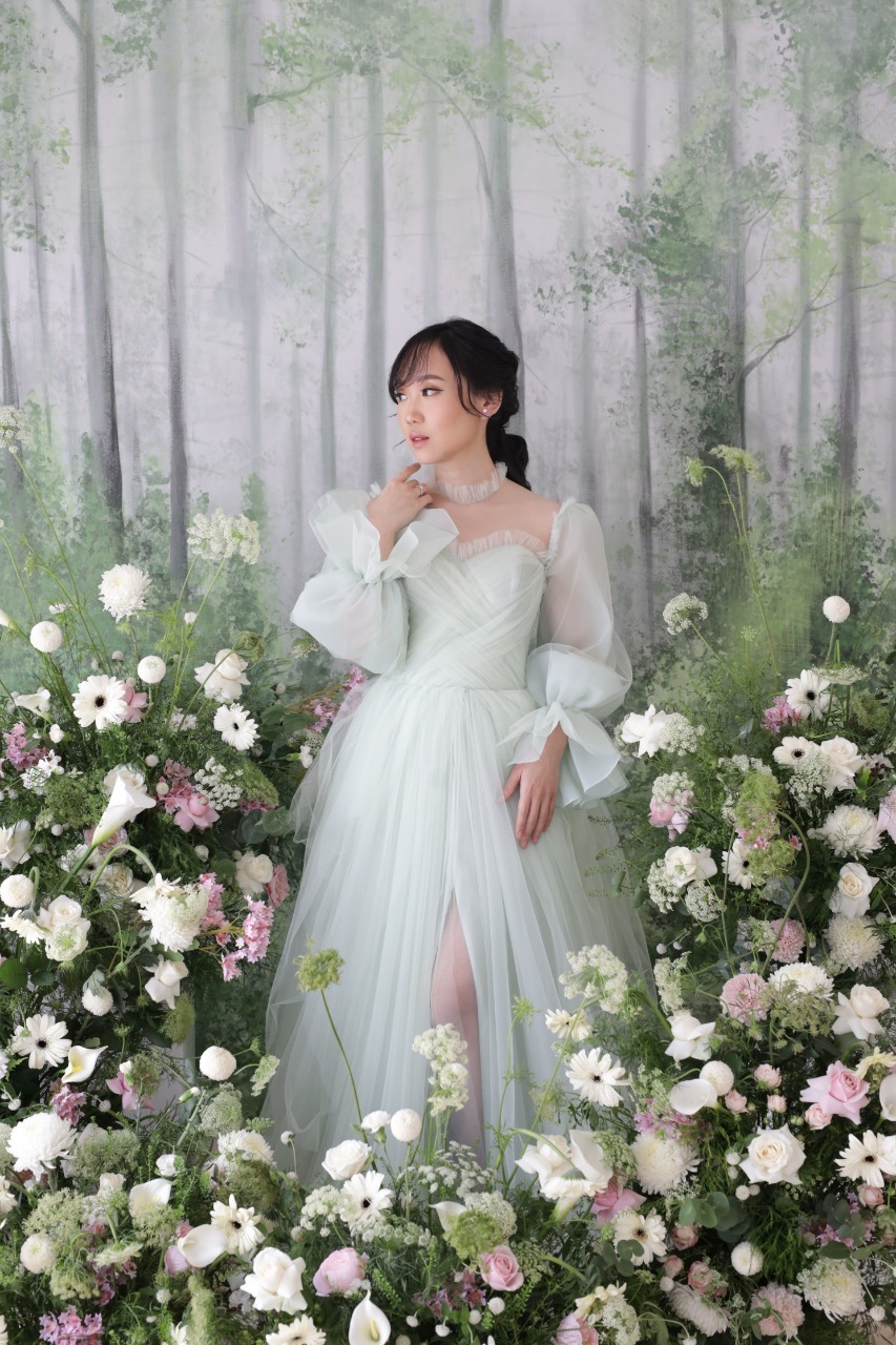 Romantic tulle dress in soft green color with puffy sleeves and front slit.