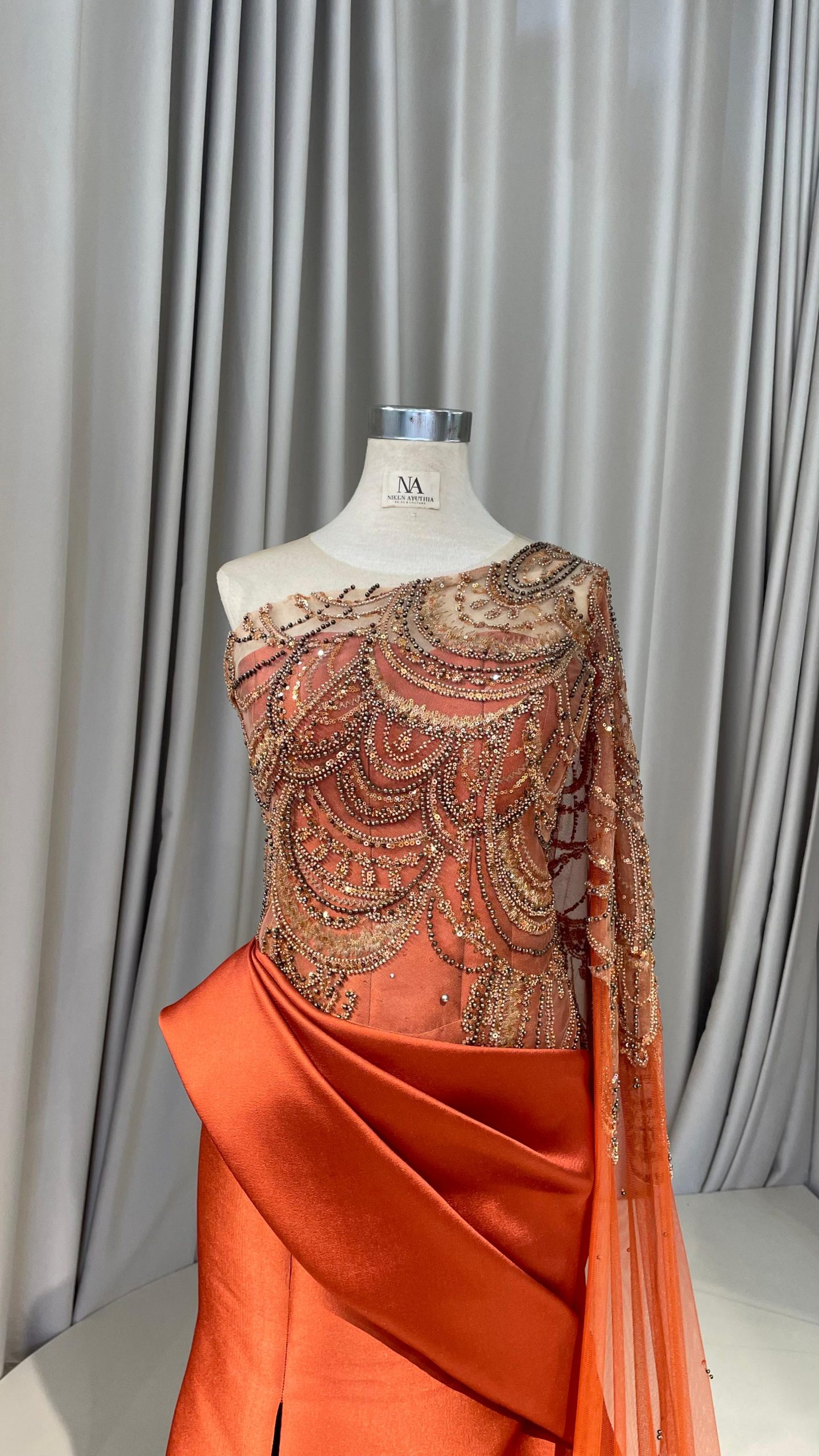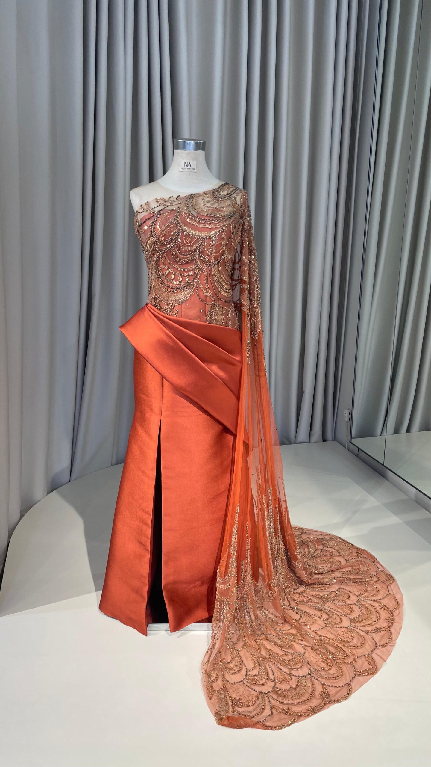 Terracotta mermaid dress with lace on upper part, asymmetrical sleeves, drapery on the waist, and full lace cap.