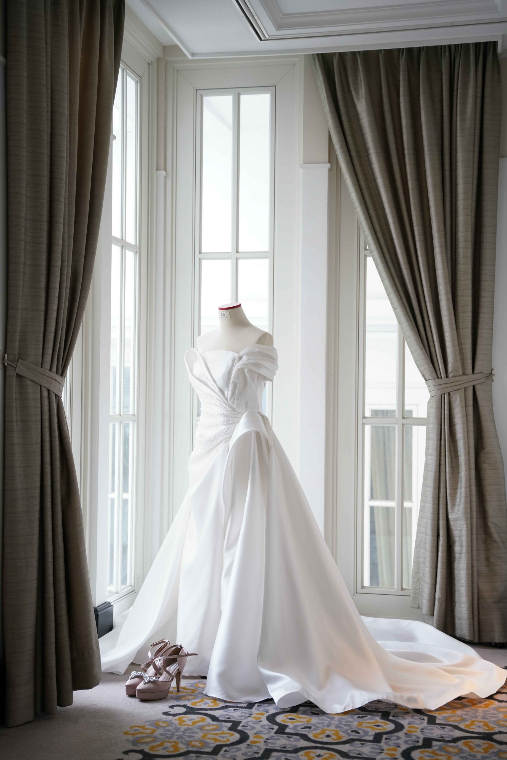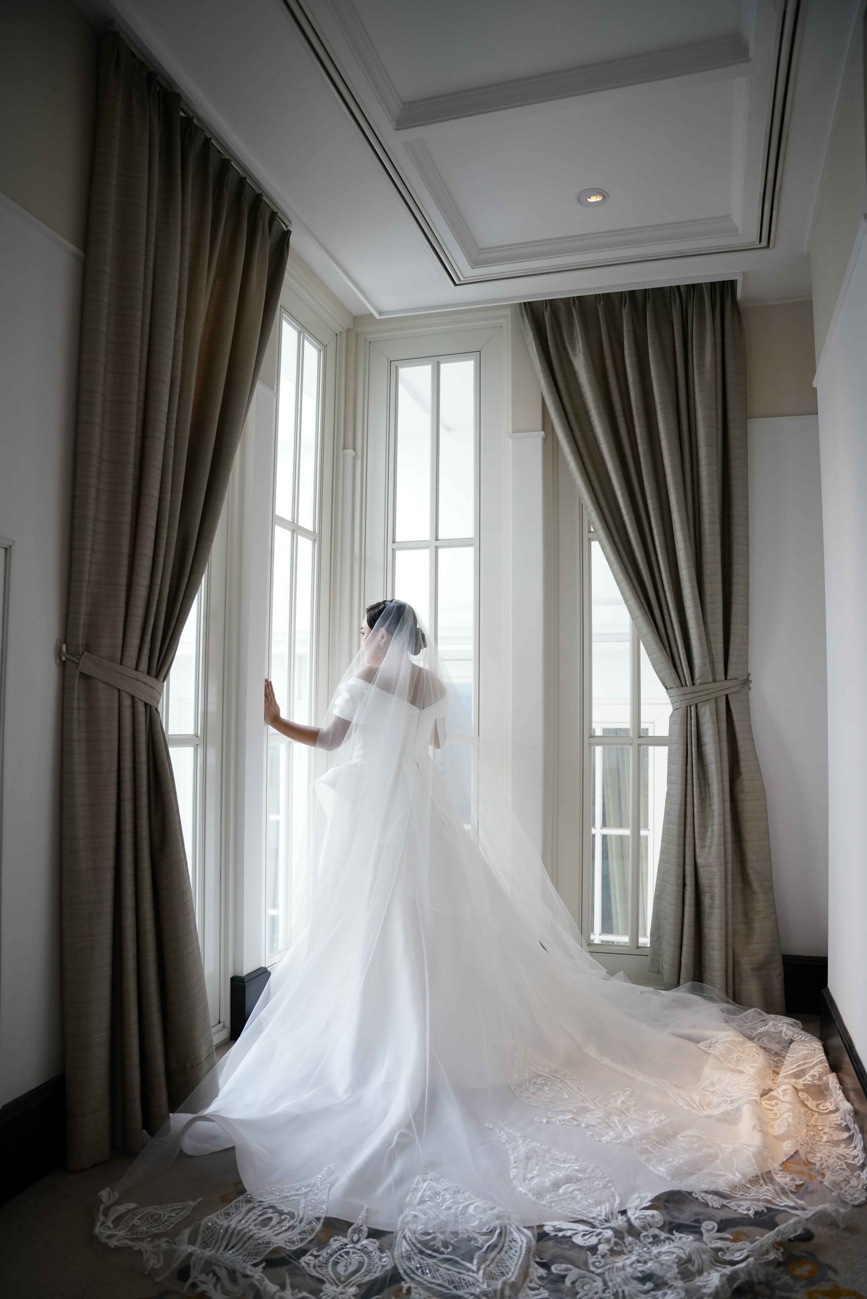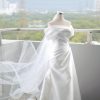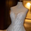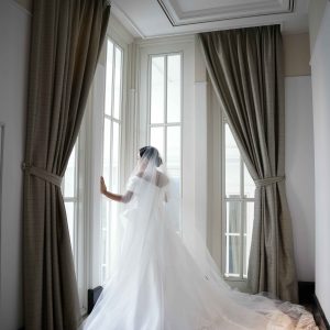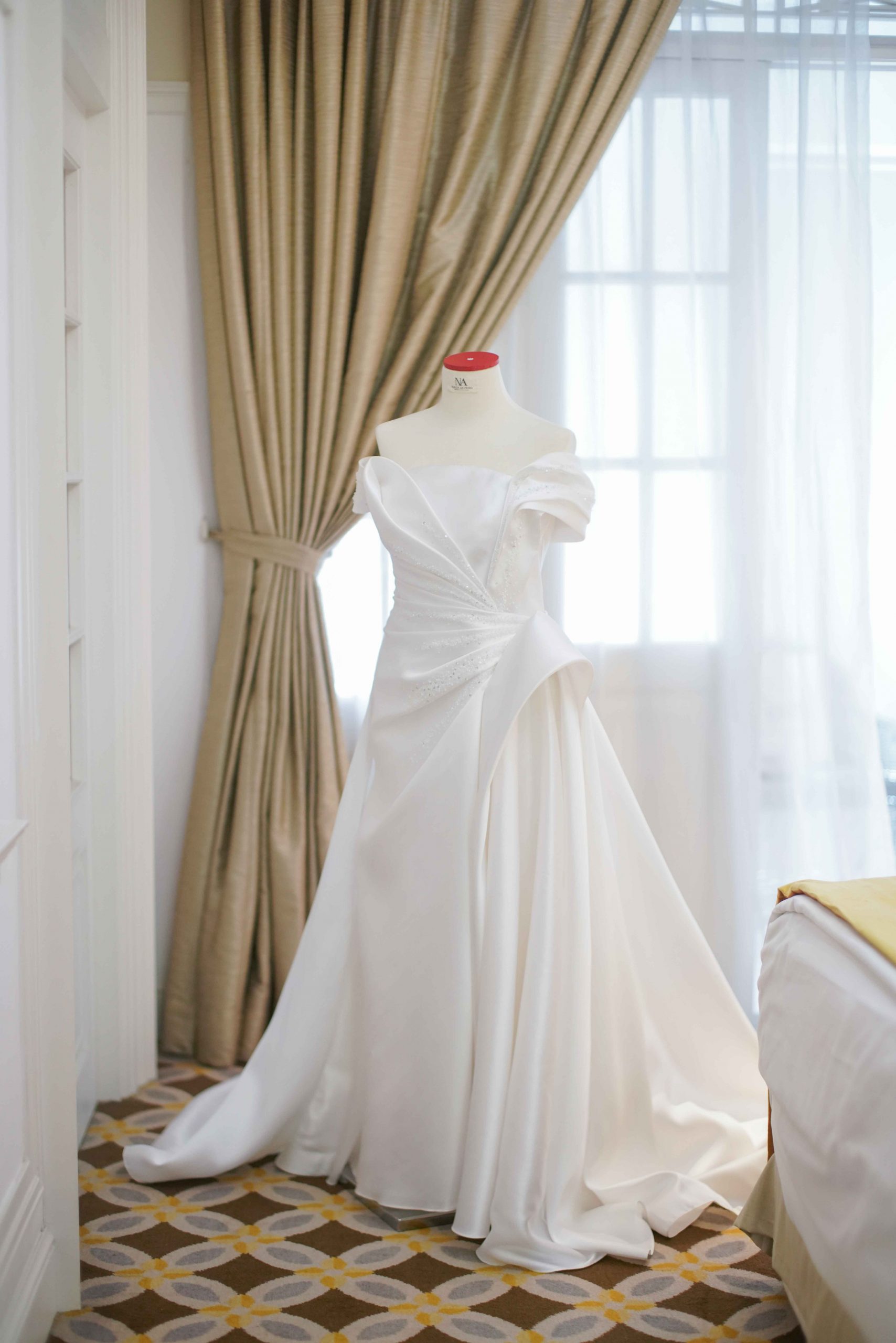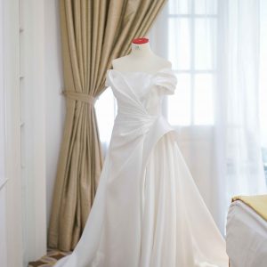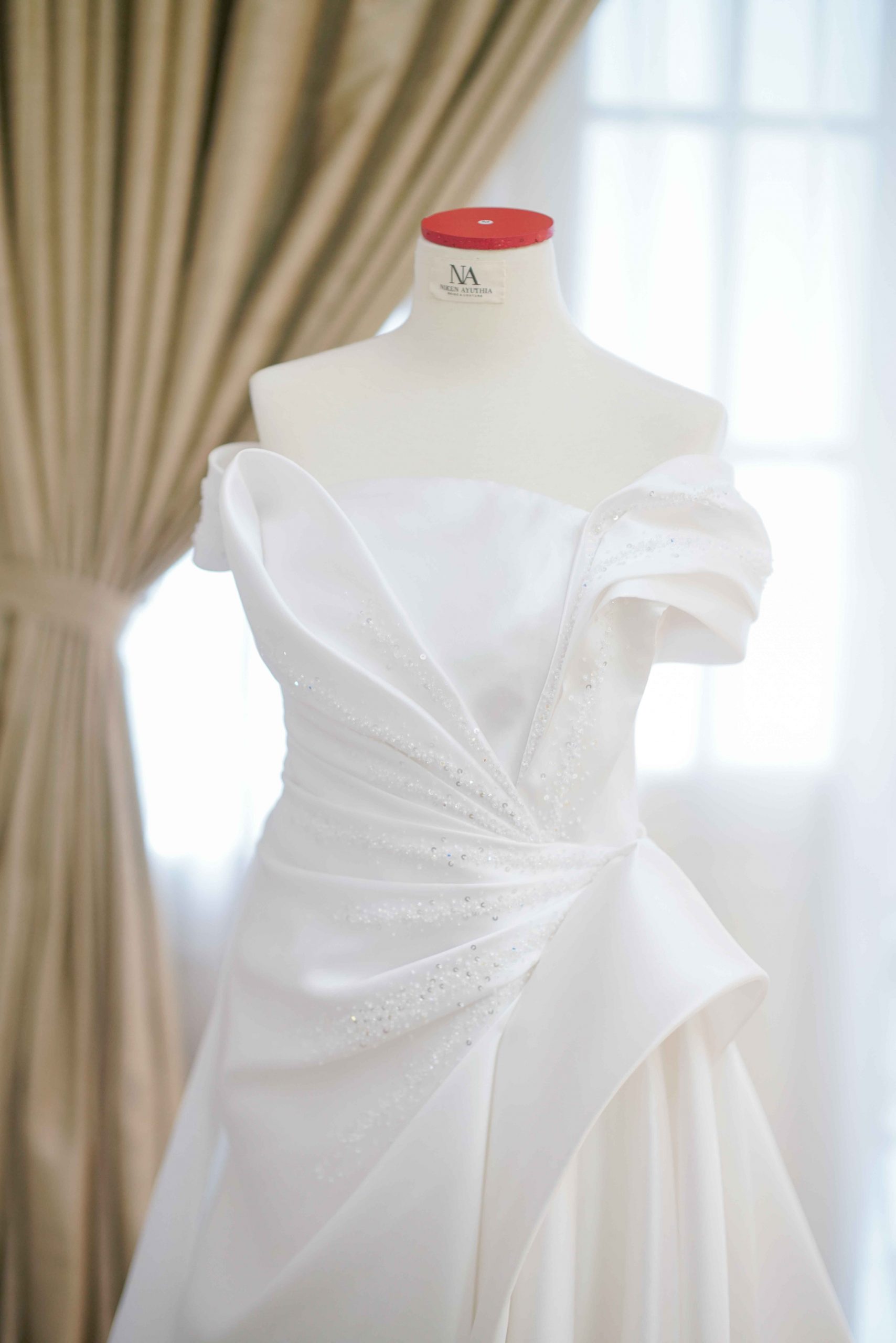 Simple semi mermaid wedding dress with beaded drapery around the bodice. Match it with our beautiful baroque detailed veil to enhance the whole look.