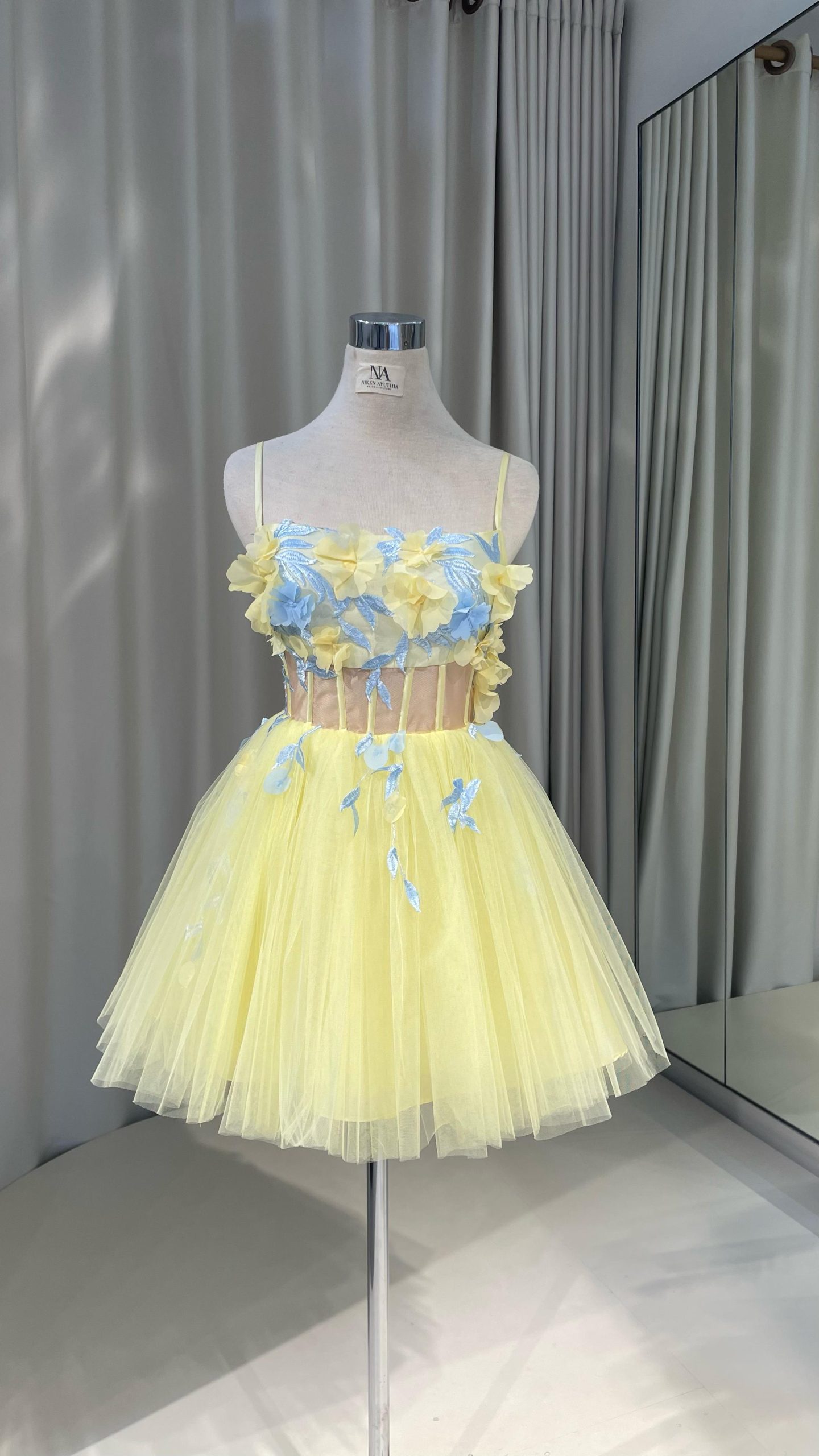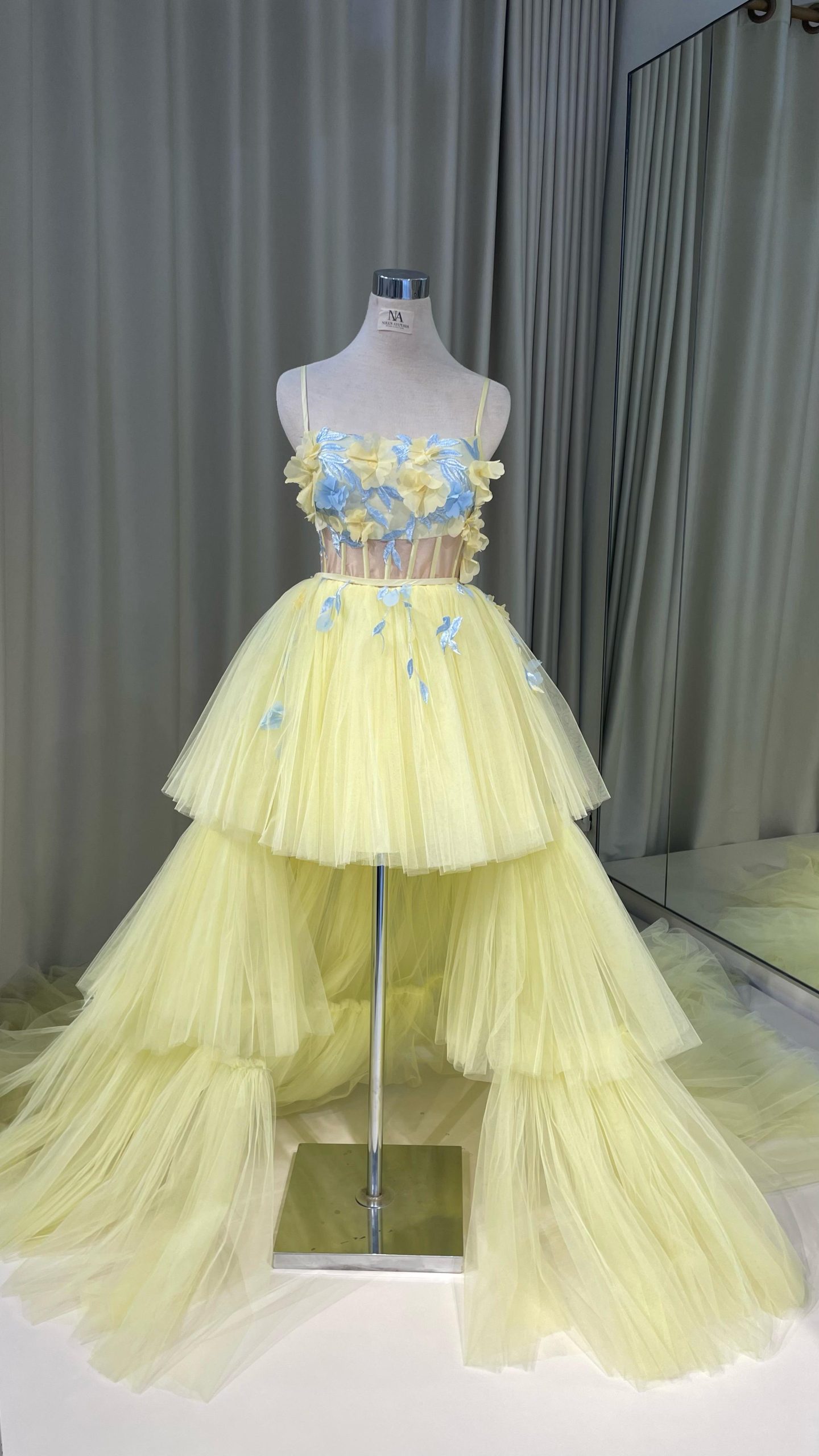 Yellow tiered tulle dress with bustier top and flower details.